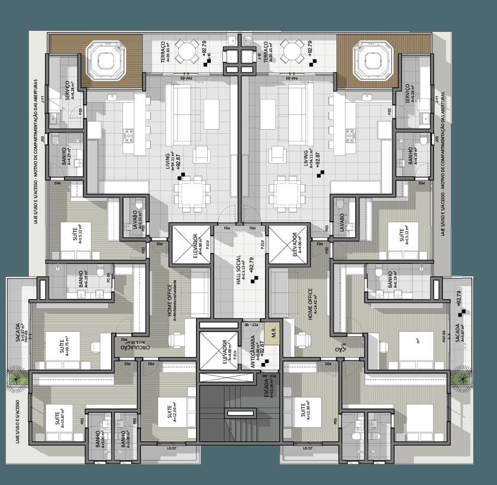 As coberturas apresentam 215,13 m² de área privativa, configuradas com 4 suítes. O diferencial é o terraço equipado com jacuzzi, proporcionando um espaço exclusivo de lazer privativo com vista privilegiada.