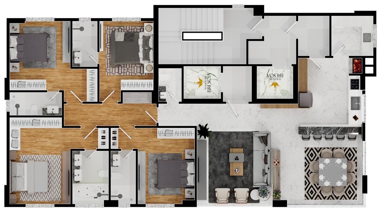 Analisamos as tipologias disponíveis no Bréscia Residencial, todas configuradas com 4 suítes e 3 vagas de garagem. As áreas privativas variam, oferecendo espaços internos amplos, living integrado e churrasqueira a carvão. O condomínio dispõe de academia, piscina com prainha e salão de festas, agregando valor ao estilo de vida dos moradores.