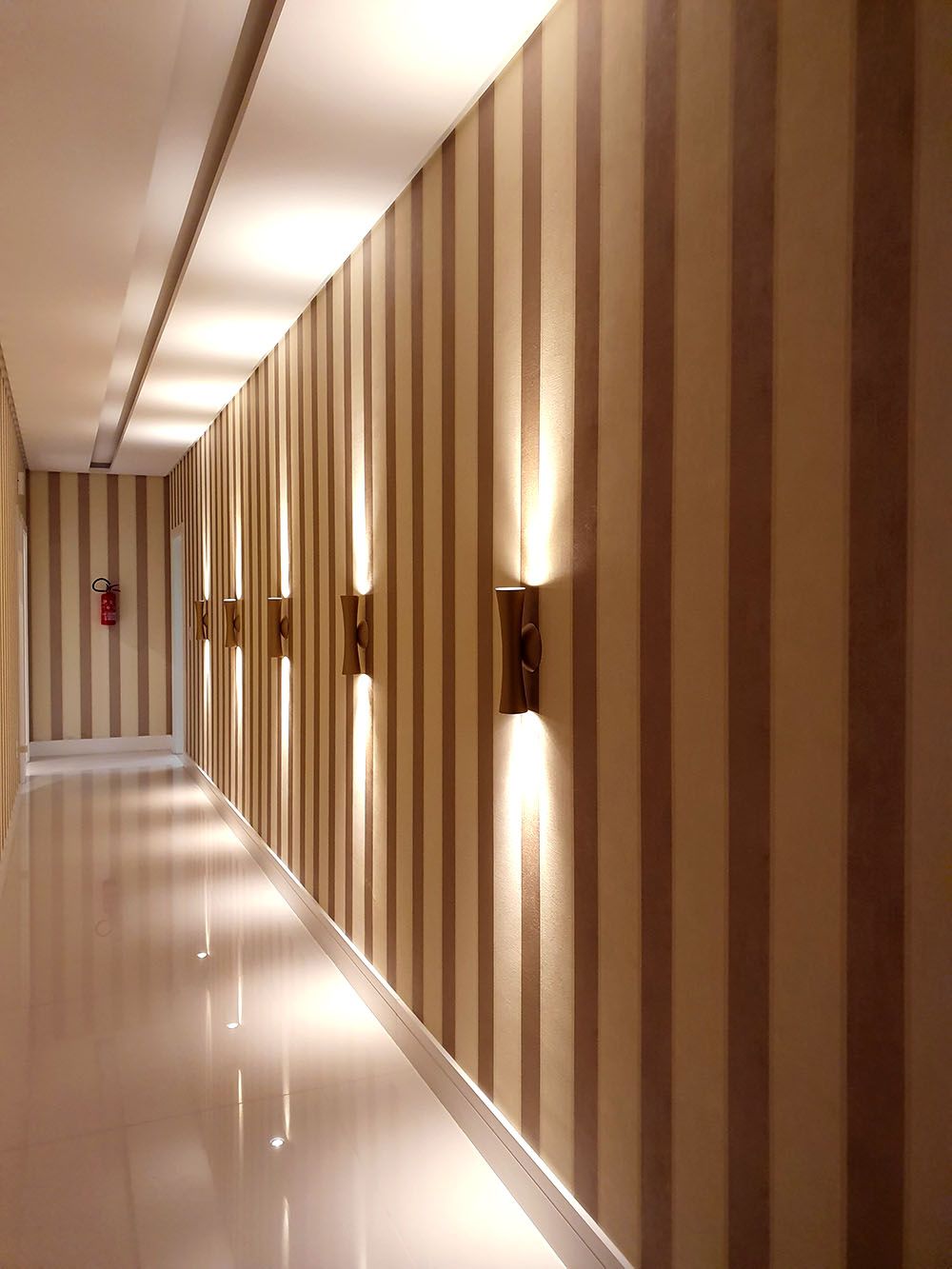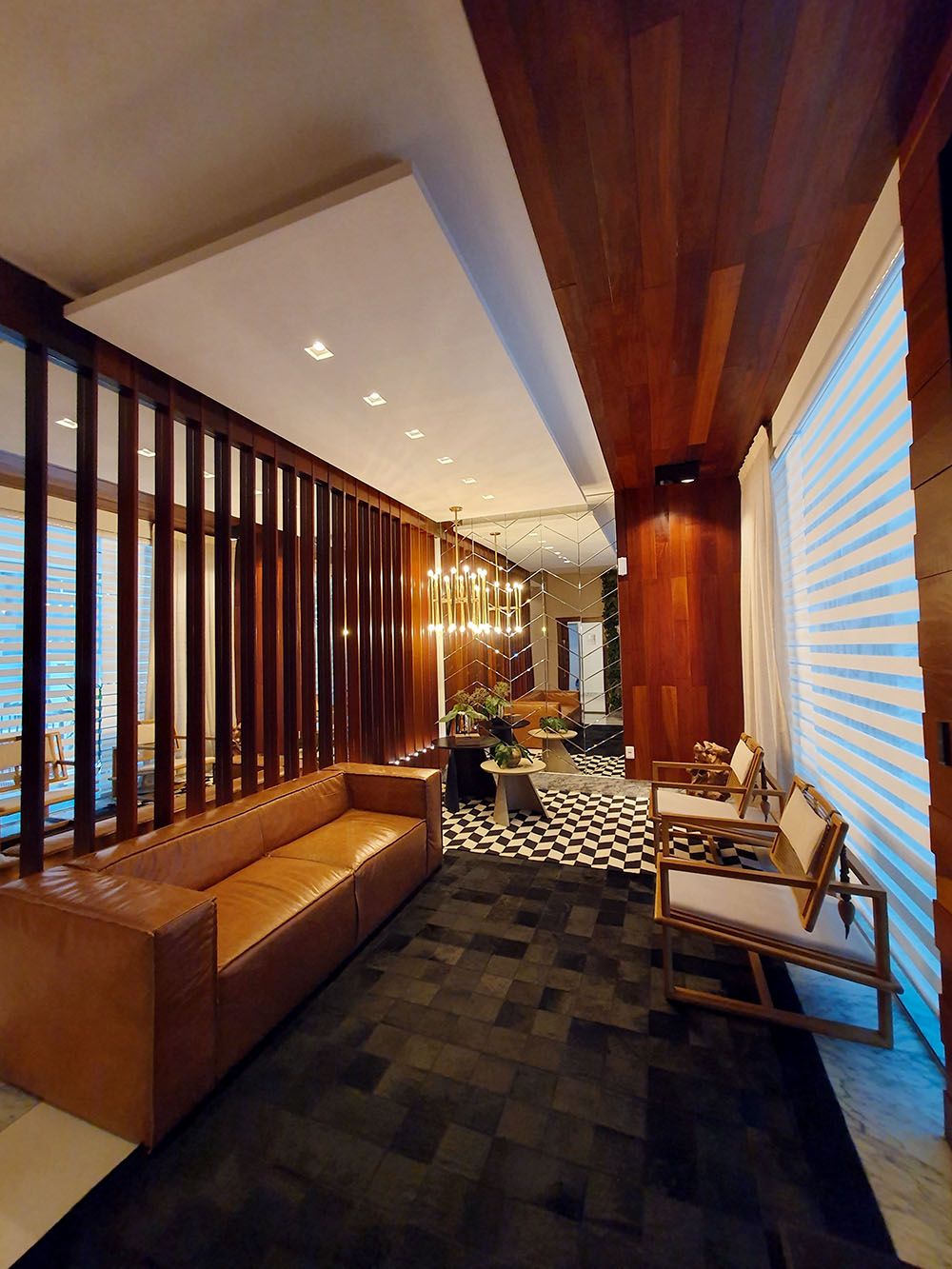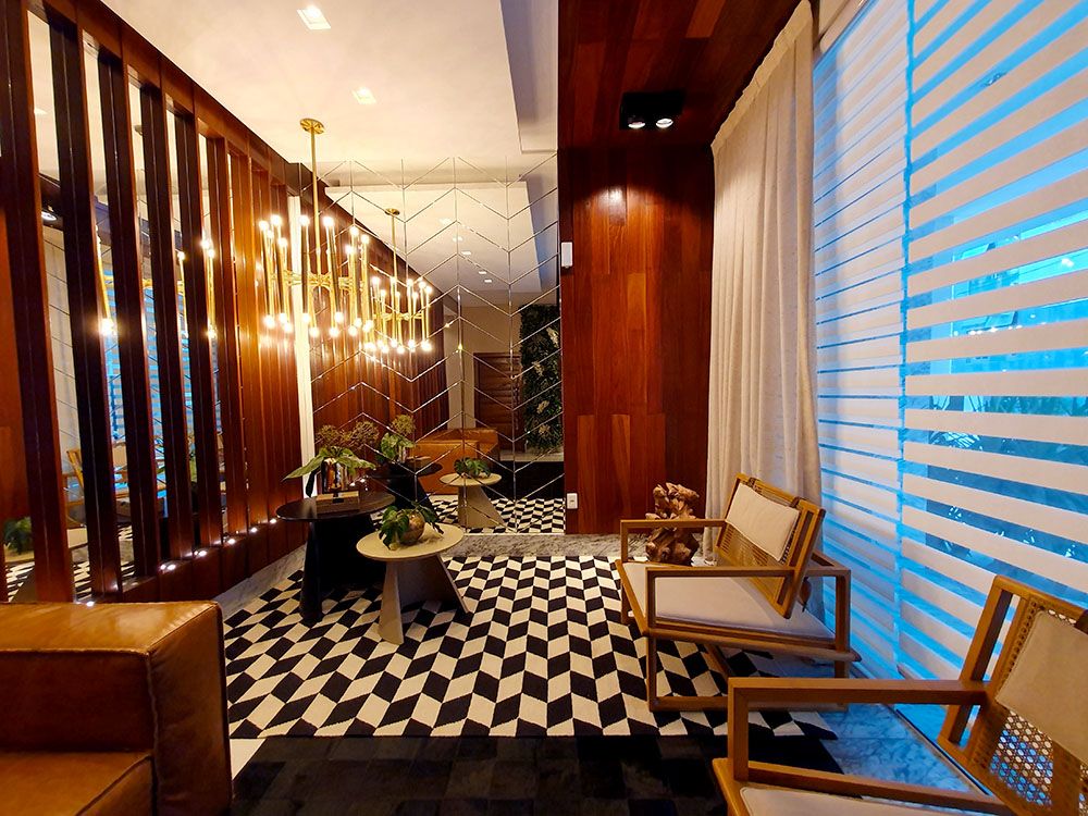 O design é moderno, com fachada em pele de vidro e hall de entrada decorado e mobiliado, refletindo um padrão de alto acabamento.