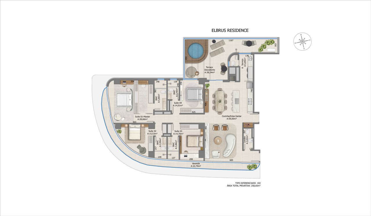 As unidades diferenciadas possuem 4 dormitórios e 4 suítes, com 258,65 m² de área privativa. Este layout proporciona mais espaço social e áreas técnicas dedicadas. A vista e a distribuição interna são pensadas para maximizar o aproveitamento da luz natural e a ventilação cruzada, características valorizadas no litoral.