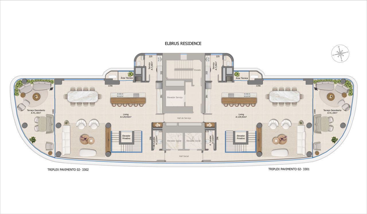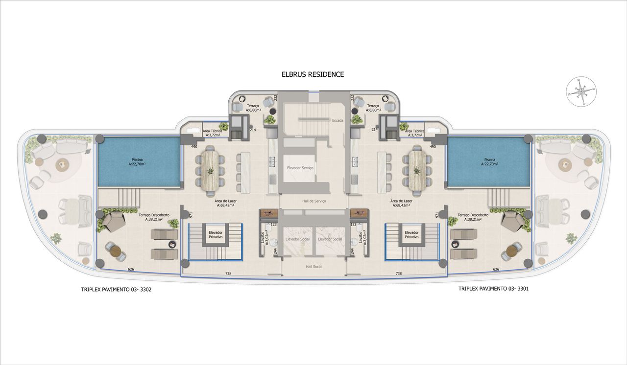 As coberturas triplex representam a maior metragem do empreendimento, com 563,00 m² de área privativa e 5 dormitórios, sendo 5 suítes. Este formato oferece exclusividade e amplos espaços de convivência, incluindo terraço técnico e áreas de lazer privativas, além de 4 vagas de garagem.