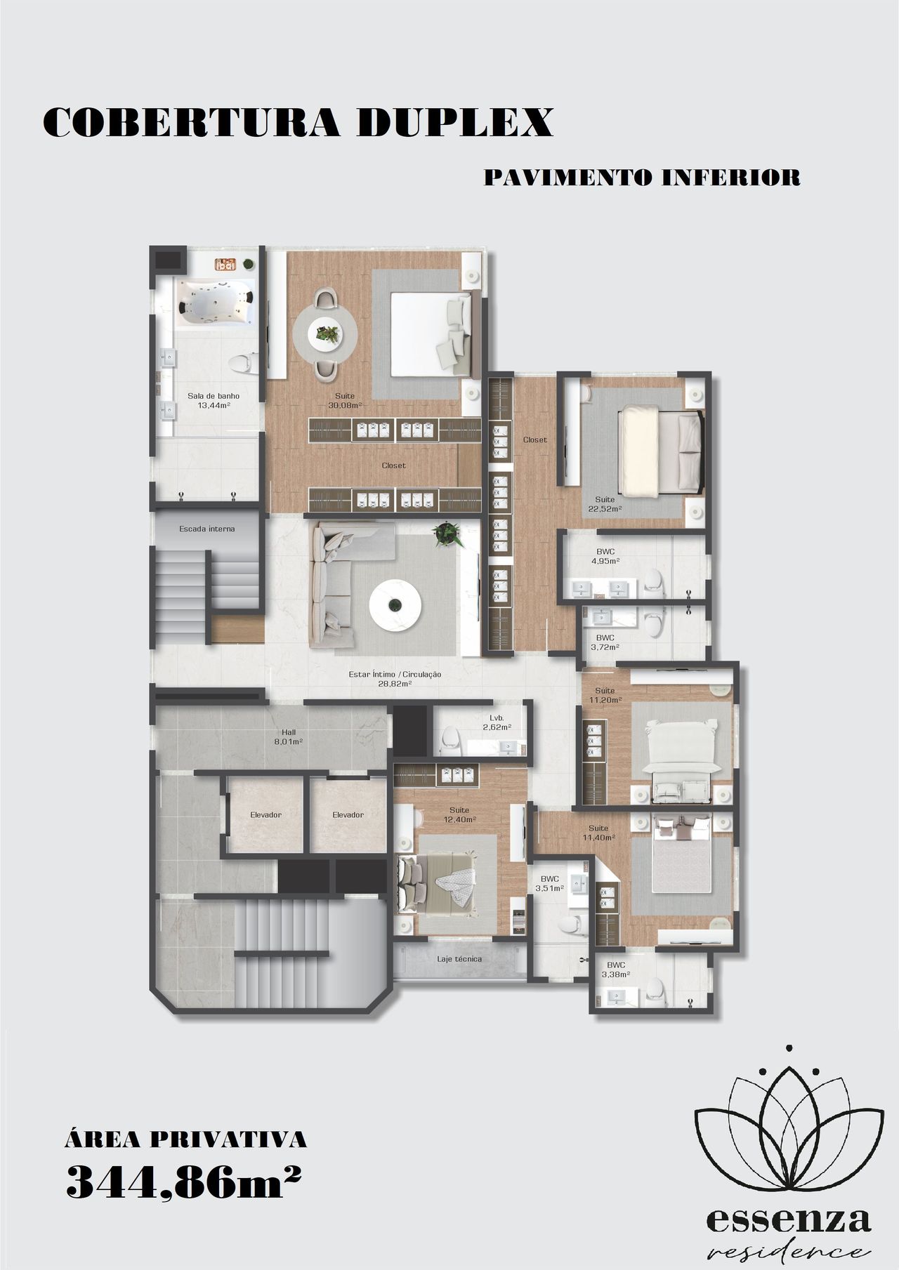 O Essenza Residence é composto por unidades, incluindo apartamentos tipo e uma cobertura duplex. As unidades oferecem 4 ou 5 suítes, com áreas privativas que variam de 172,43 m² a 344,86 m², e contam com 3 vagas de garagem. O projeto se destaca pelo pé-direito de 3,24 metros, acabamento em gesso, piso porcelanato e vinílico nas suítes, além de infraestrutura completa para split e fechadura com senha na porta de entrada.