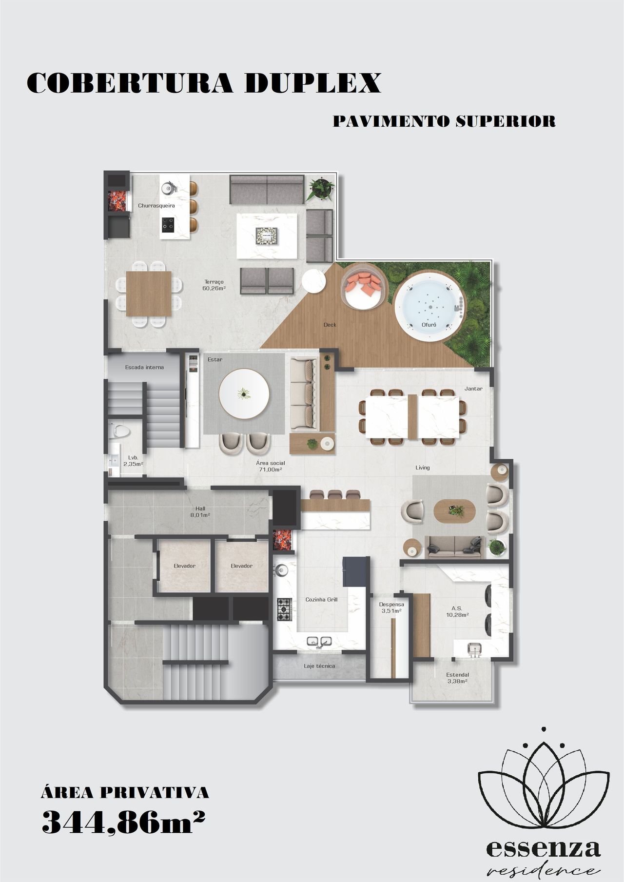 A cobertura duplex apresenta 344,86 m² de área privativa, configurada com 5 suítes, incluindo uma master com hidromassagem. O espaço conta com terraço descoberto equipado com Spa e churrasqueira a carvão, além de estar íntimo e ampla sala de estar e jantar. A unidade dispõe de 4 vagas de garagem e acabamentos diferenciados.