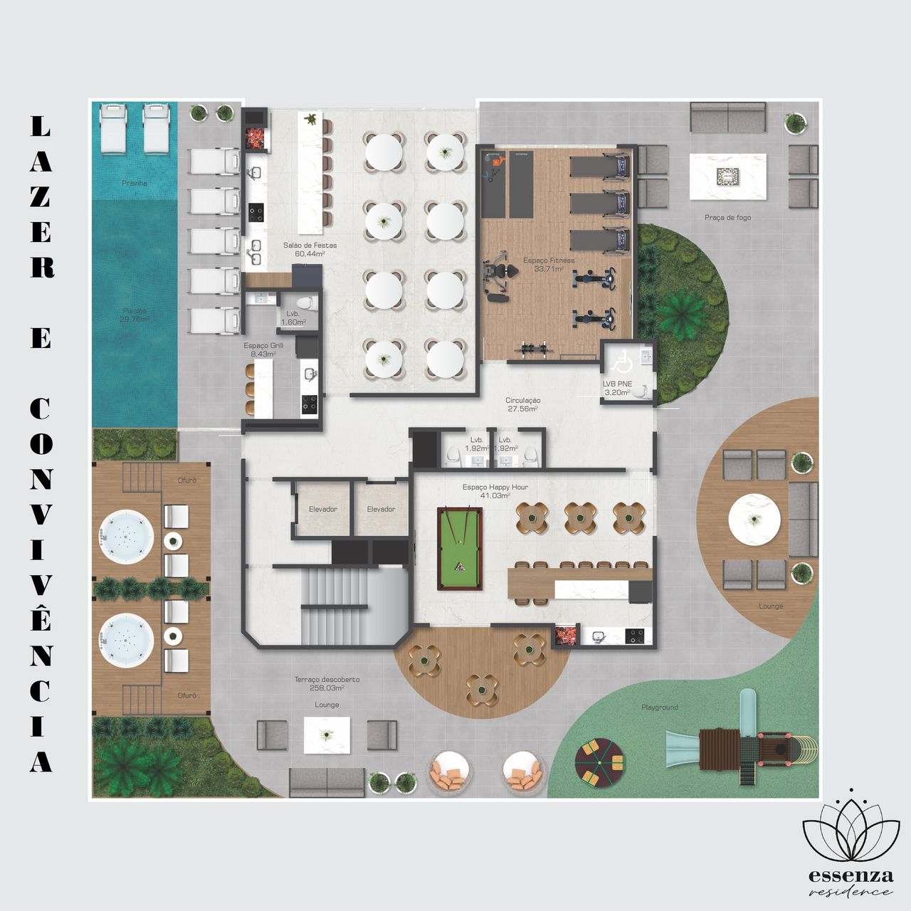 O condomínio do Essenza Residence foi projetado para garantir conforto e bem-estar, com áreas comuns entregues mobiliadas. A estrutura de lazer inclui piscina com prainha, deck, solarium, espaço fitness, spa, praça de fogo e playground. Para a segurança, dispomos de guarita com sistema de vigilância por câmeras e portaria eletrônica. A sustentabilidade é contemplada com reservatório de água das chuvas e medidores individuais.