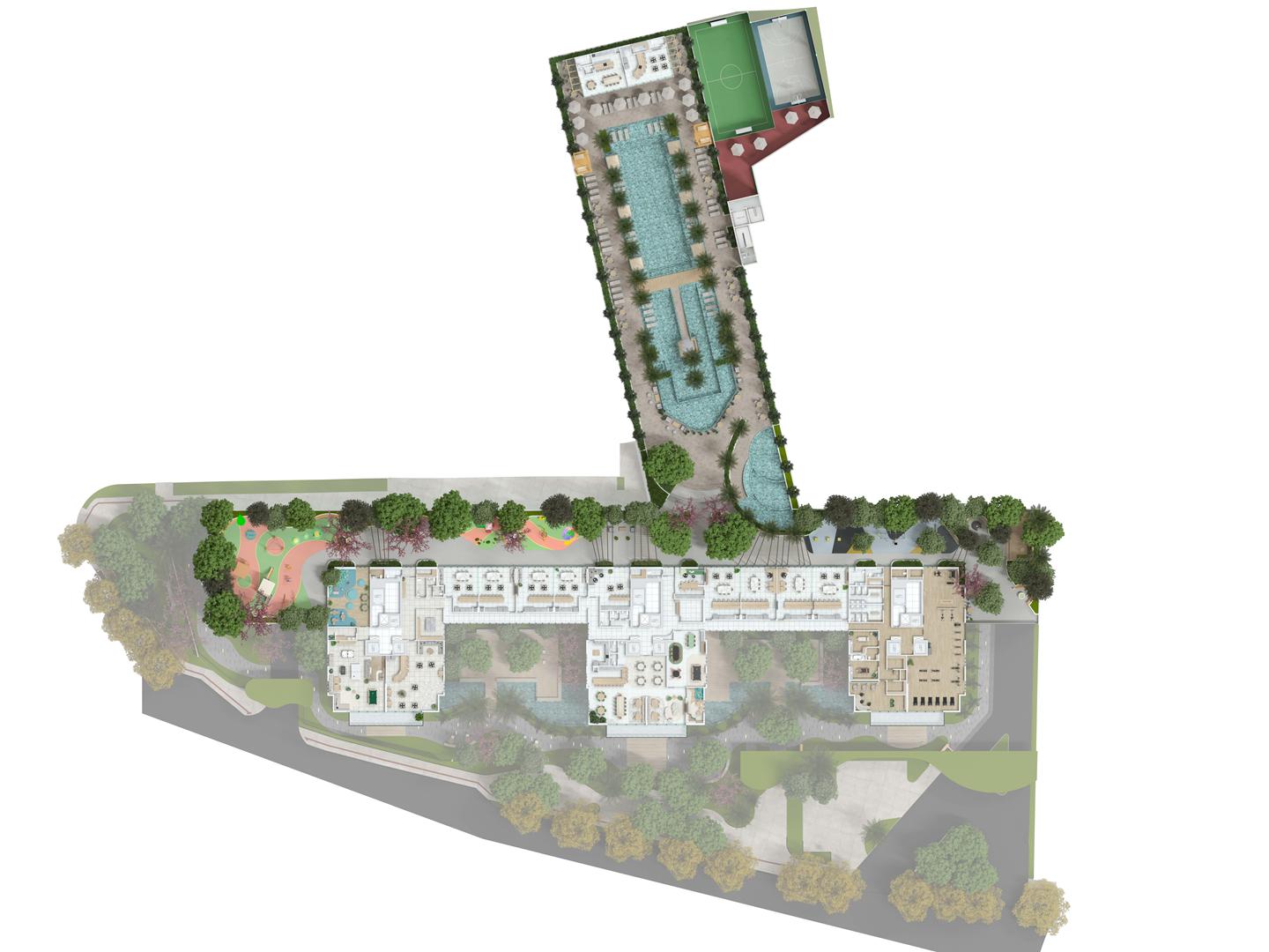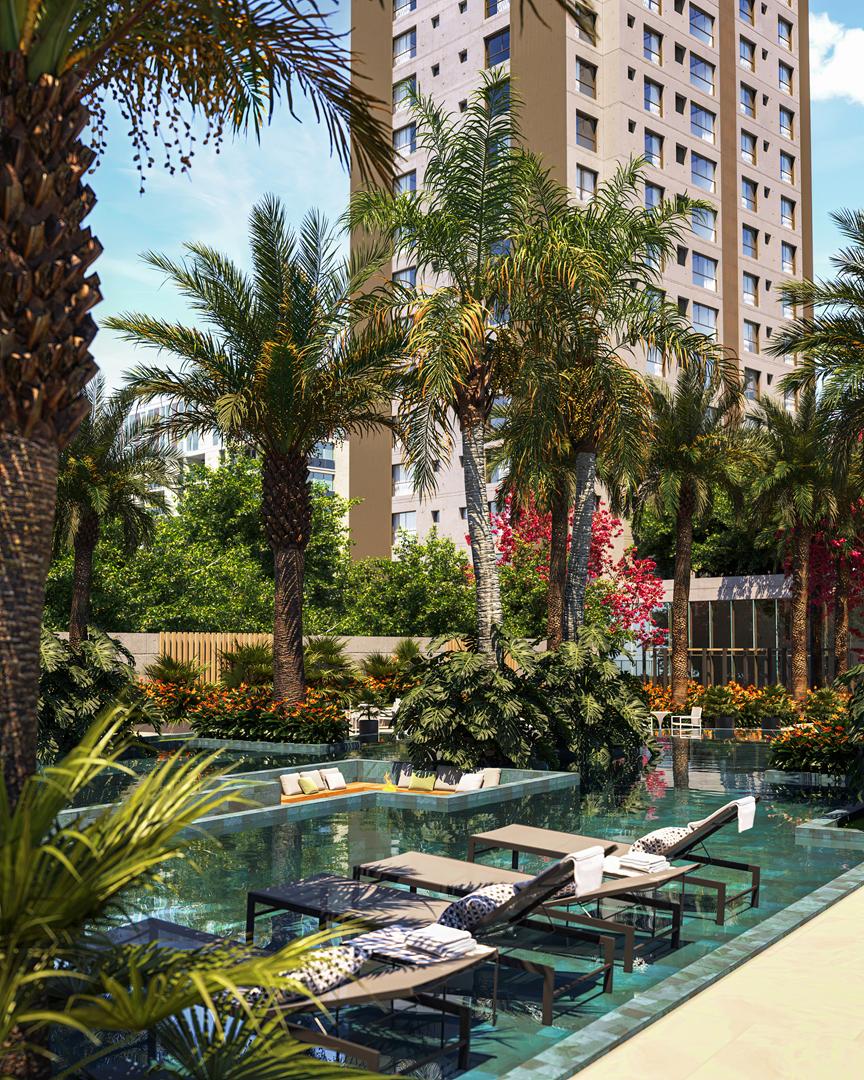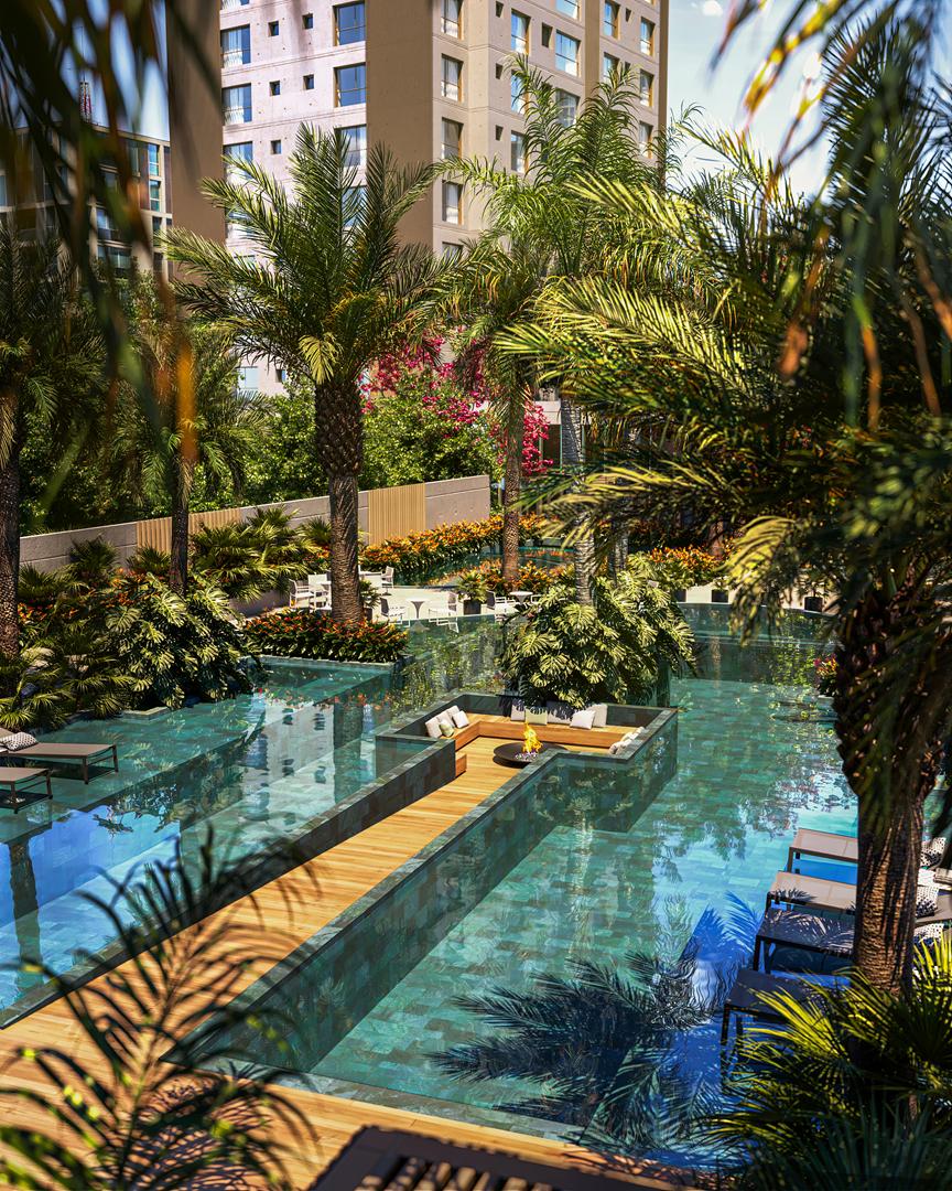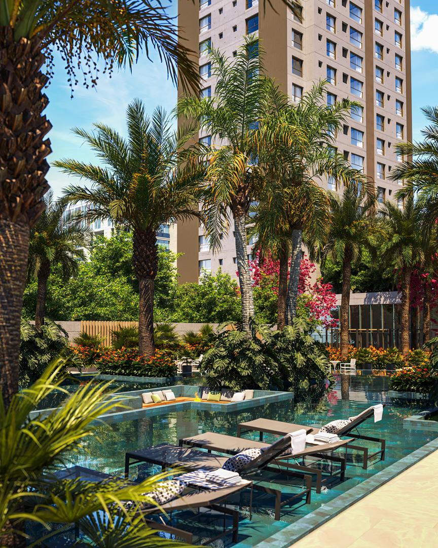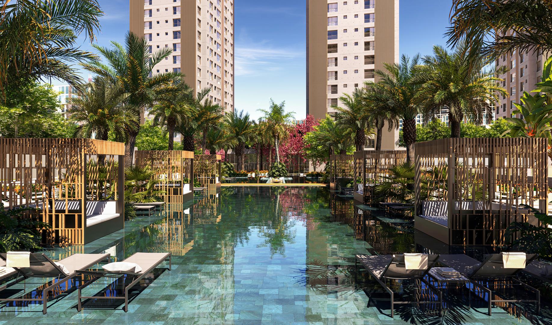 O condomínio oferece piscina, spa, sauna úmida, massagem, espaços gourmet, pub, salão de festas, brinquedoteca, playground, quadras, academia, pilates, pet care, empório, salas de reunião, espaços externos e diversas áreas de convivência.
