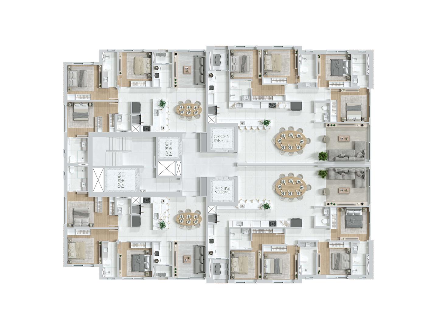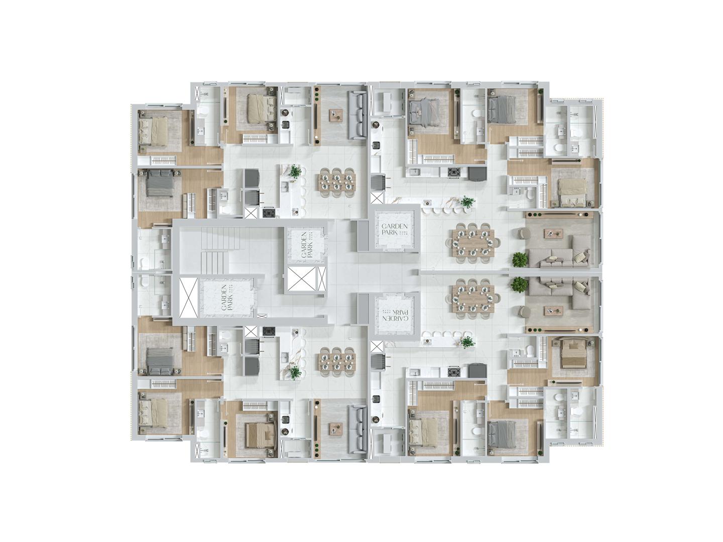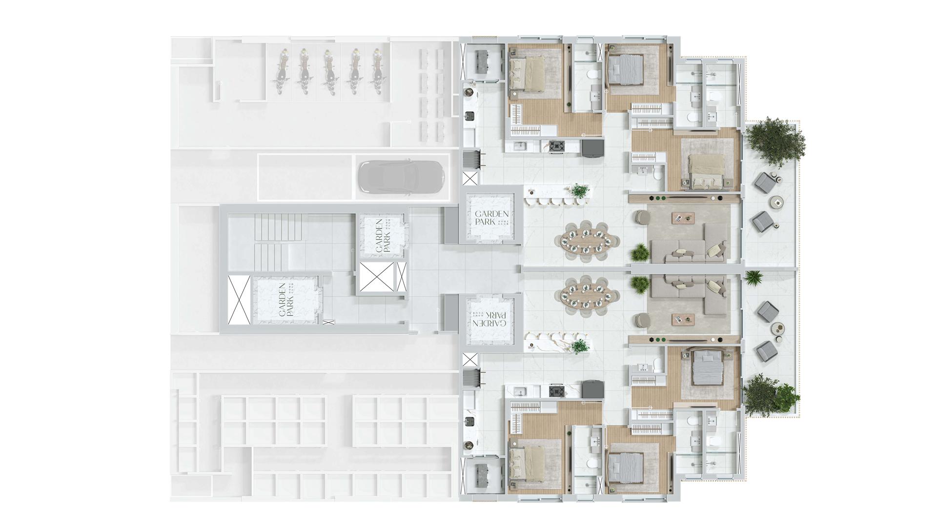 Os apartamentos do Garden Park Home Club apresentam metragens de 102 m² a 168 m² nas tipologias tipo e diferenciadas, com 3 a 4 suítes e 2 a 3 vagas de garagem. As plantas foram desenhadas para valorizar a ventilação natural, integrar áreas sociais e proporcionar amplitude. As unidades oferecem varanda coberta, acabamentos de alto padrão e distribuição equilibrada dos ambientes, garantindo conforto e privacidade.