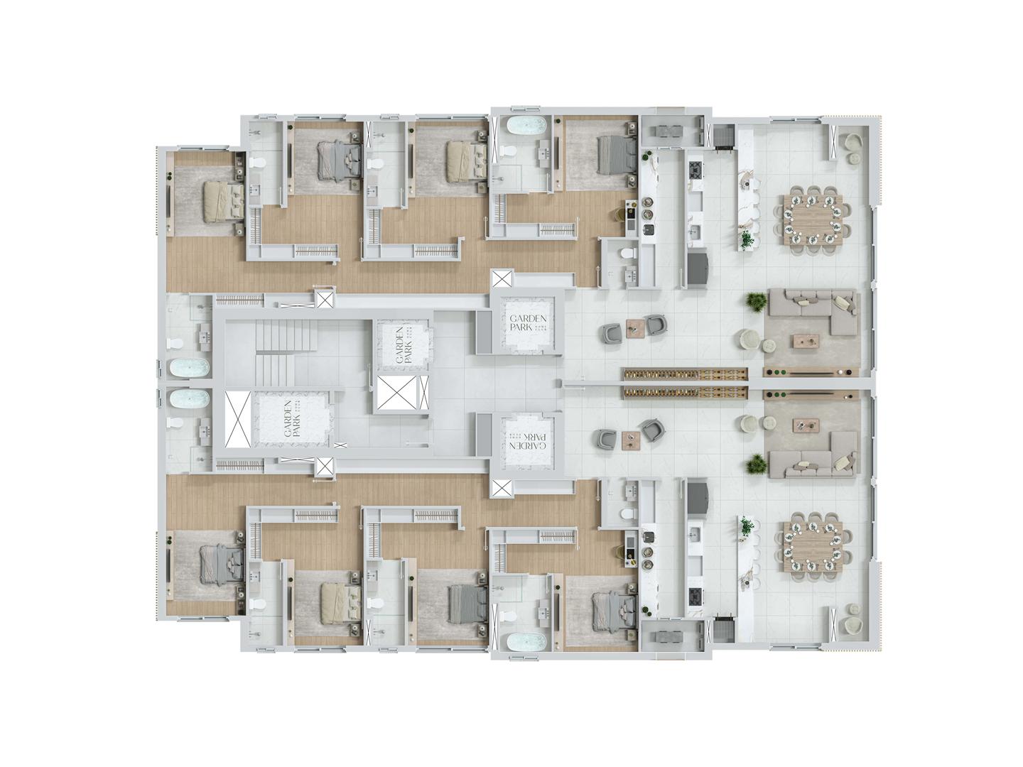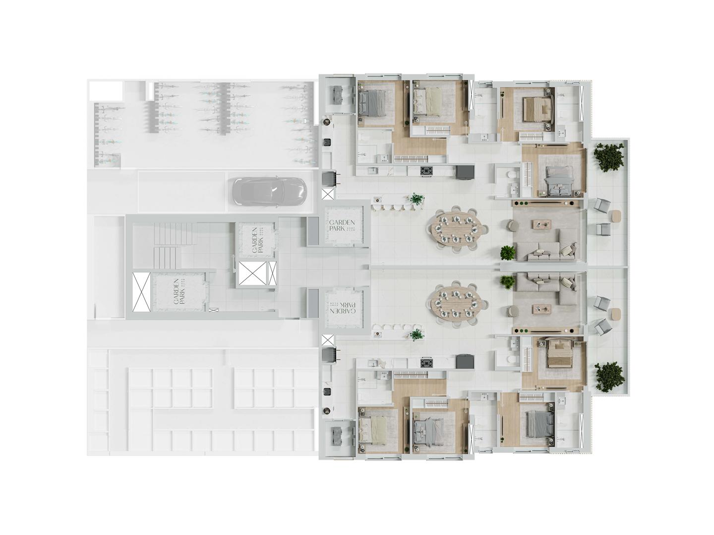As coberturas do Garden Park Home Club são representadas pelo apartamento master, que conta com 252 m² e planta de 4 suítes, além de 3 vagas de garagem. O layout privilegia amplitude nas áreas sociais, varanda integrada e distribuição funcional dos ambientes. Os acabamentos seguem o padrão elevado da construtora, garantindo conforto, sofisticação e excelente aproveitamento de iluminação natural.