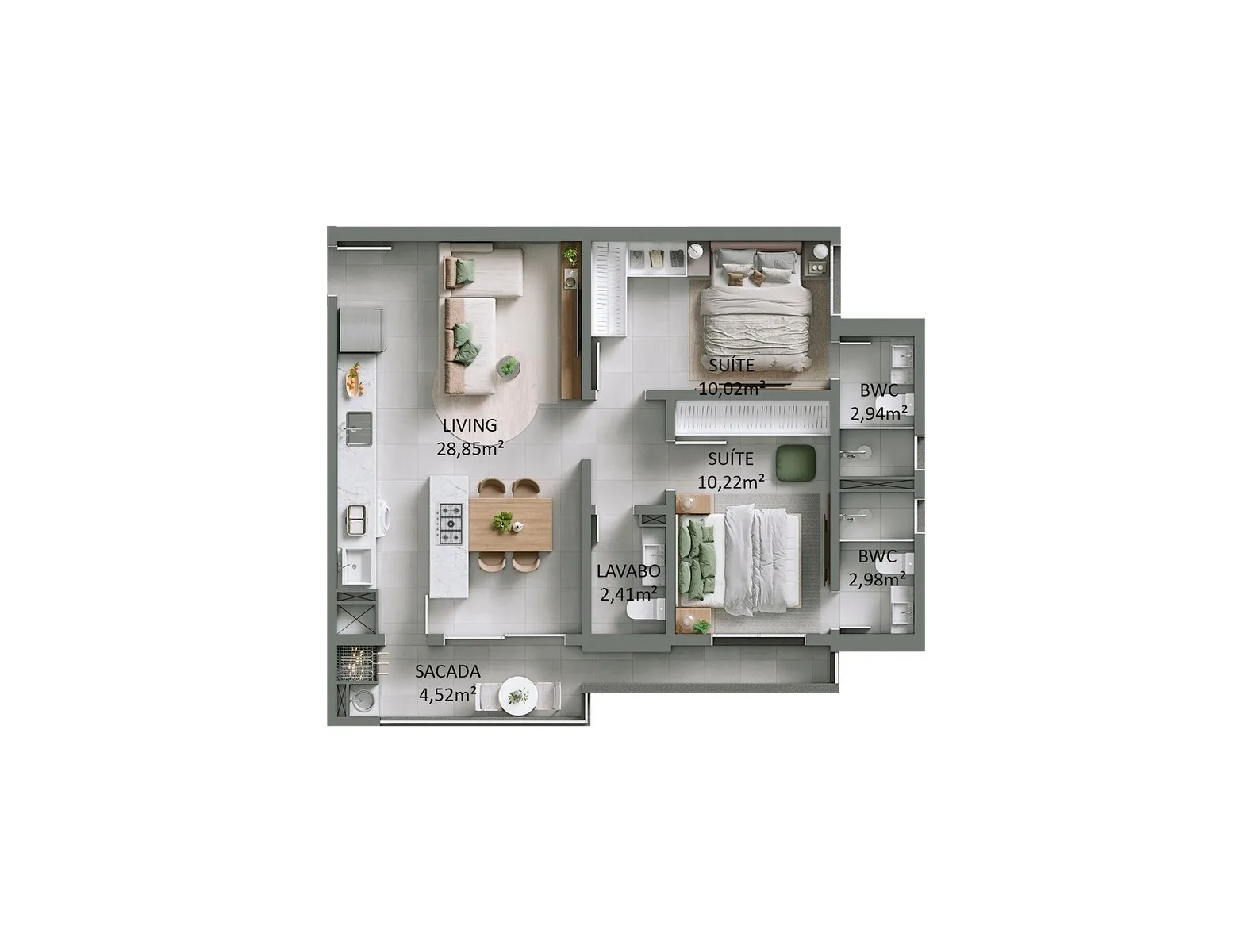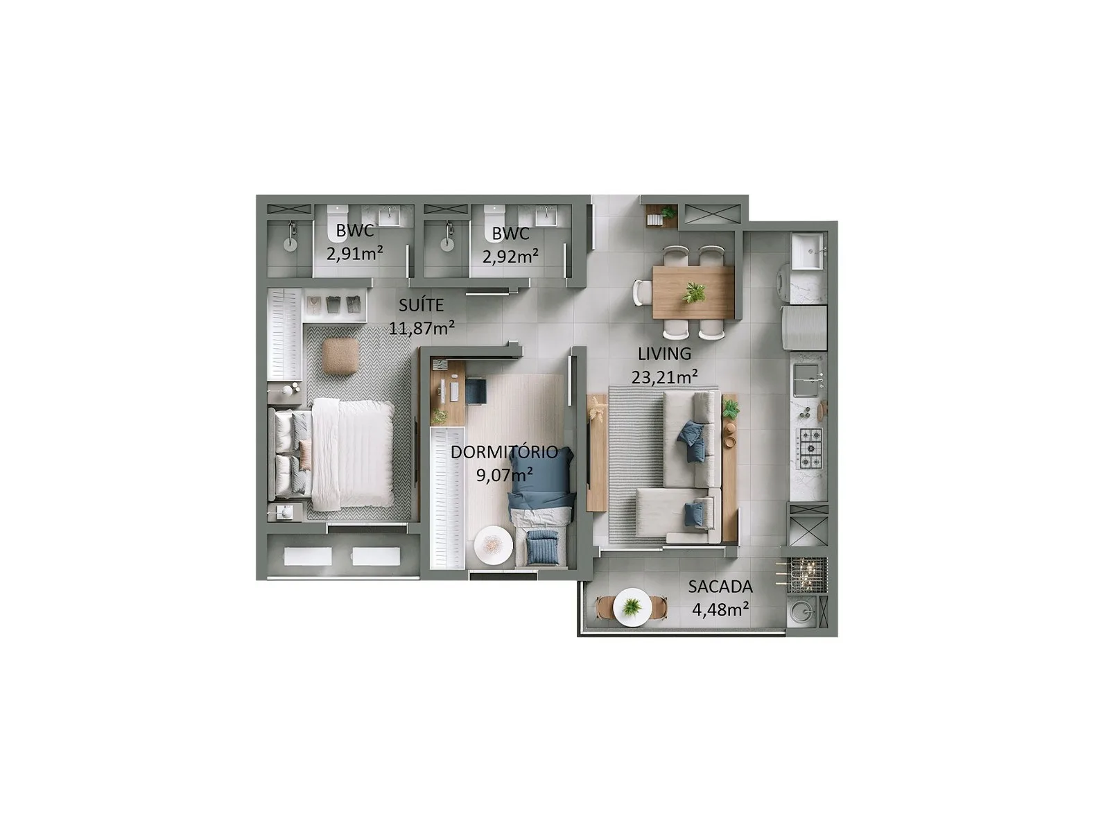 As unidades variam entre 67,56 m² e 120,19 m², com opções de 1 a 3 dormitórios, até 2 suítes e 2 vagas. Os apartamentos contam com plantas bem distribuídas, sacada com churrasqueira, pisos em porcelanato e infraestrutura para ar-condicionado split. As áreas comuns oferecem mais de 15 opções de lazer, incluindo piscina, academia e espaços gourmet. Tudo isso com acabamento refinado e localização estratégica em Itajaí.