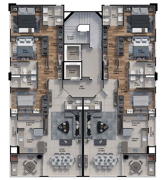 O projeto prevê 2 apartamentos por andar, garantindo maior privacidade aos moradores.