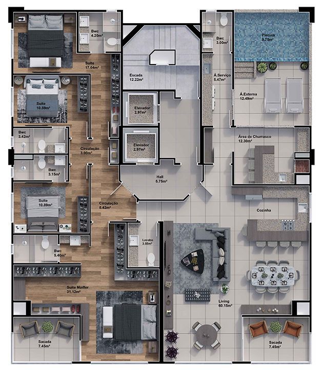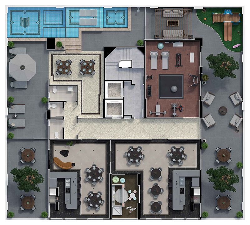 A cobertura do Hannover oferece 241,90 m² de área privativa, projetada para quem busca maior exclusividade. Esta unidade conta com 4 suítes, piscina privativa e churrasqueira a carvão na área externa. A distribuição interna foi pensada para maximizar o aproveitamento dos espaços e a integração dos ambientes, mantendo o padrão de acabamento de alto nível do empreendimento.