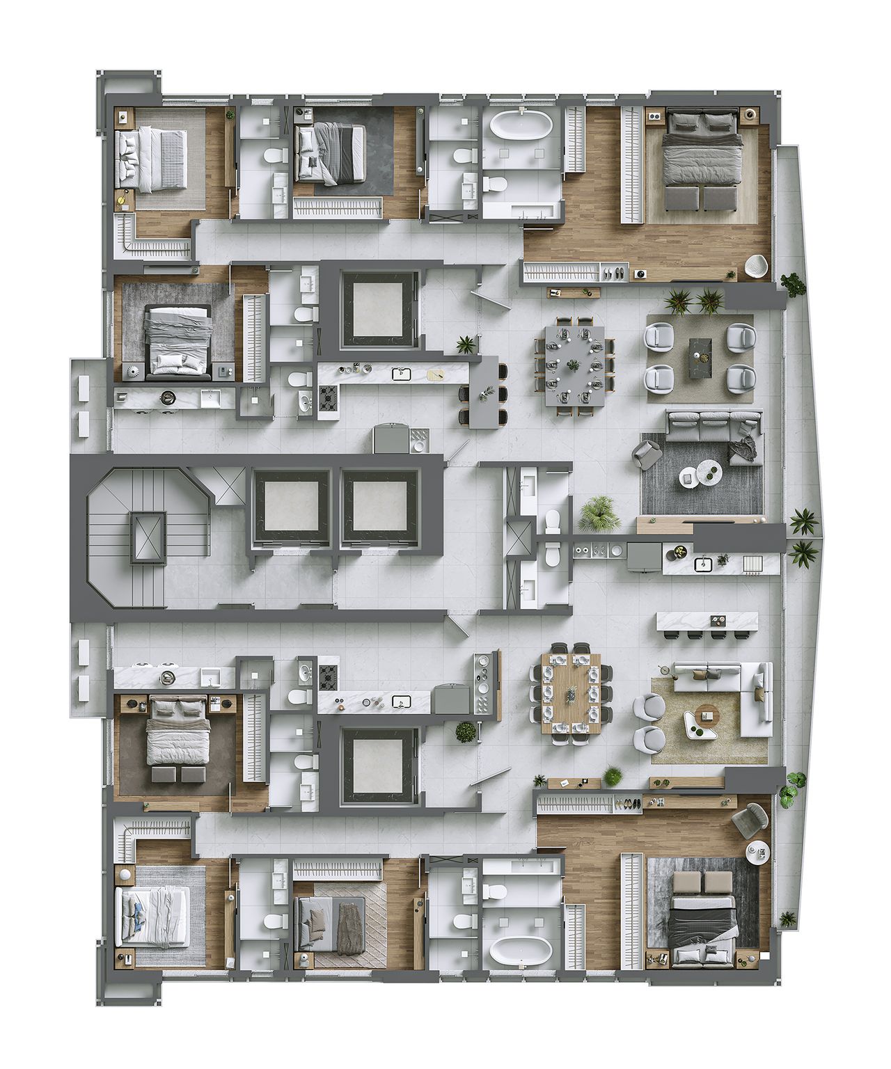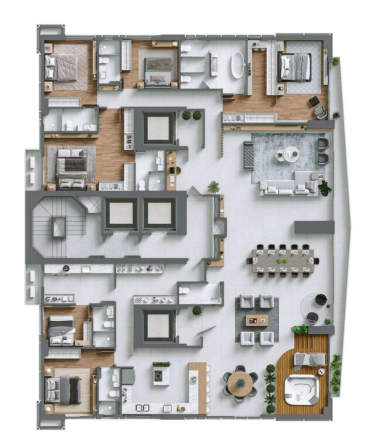 O empreendimento oferece apartamentos tipo com 4 suítes e penthouses com 6 suítes.