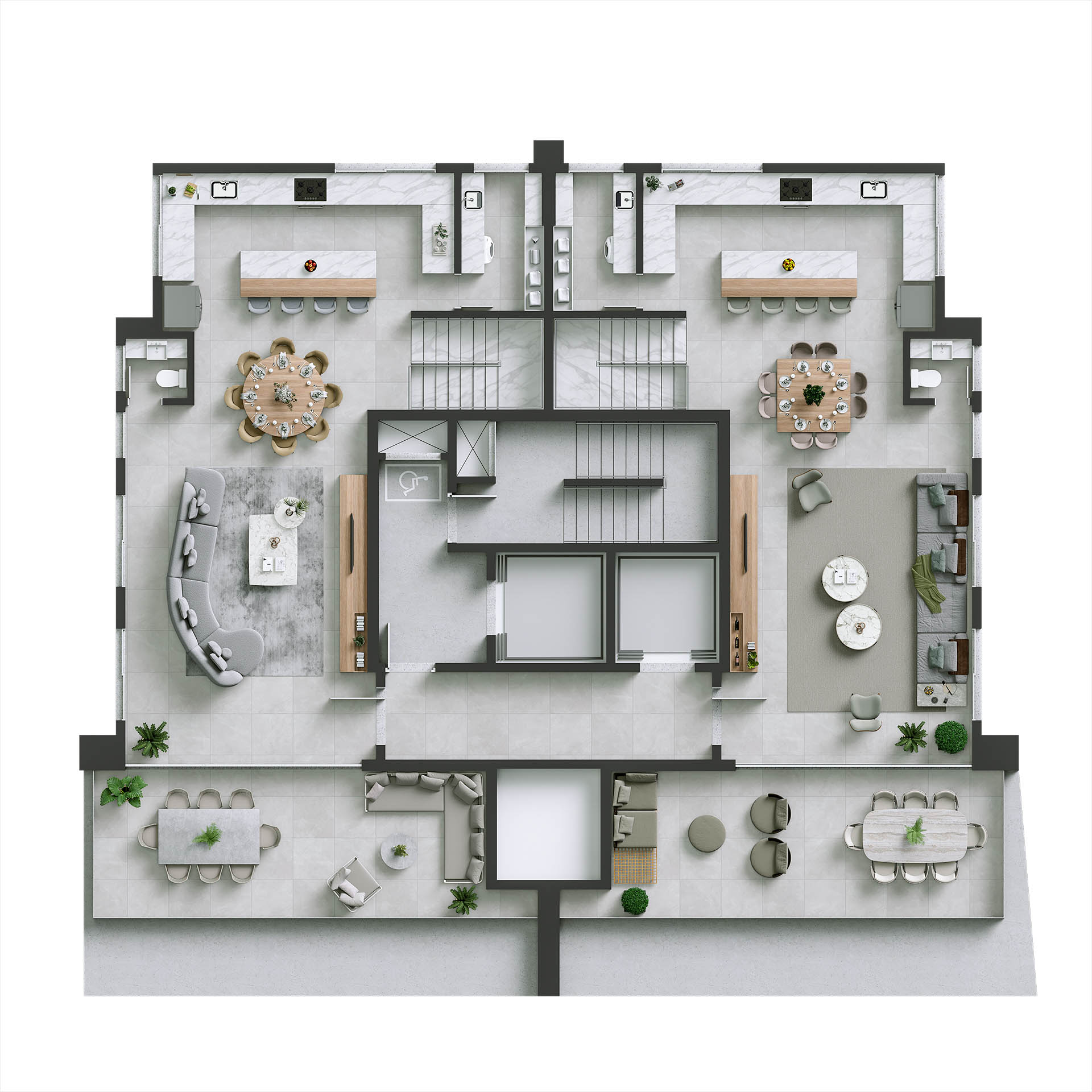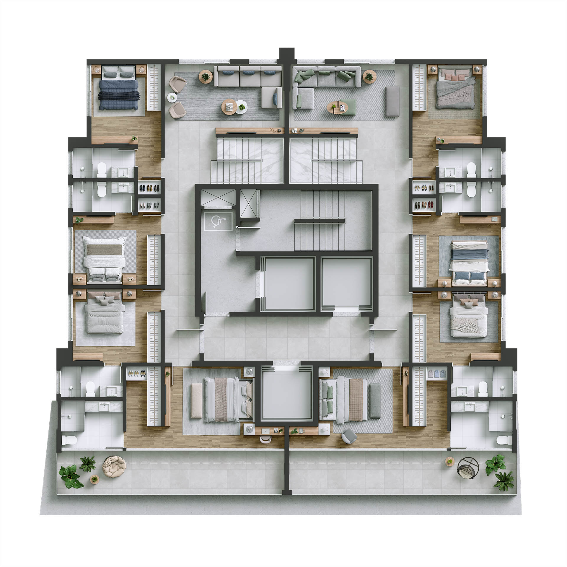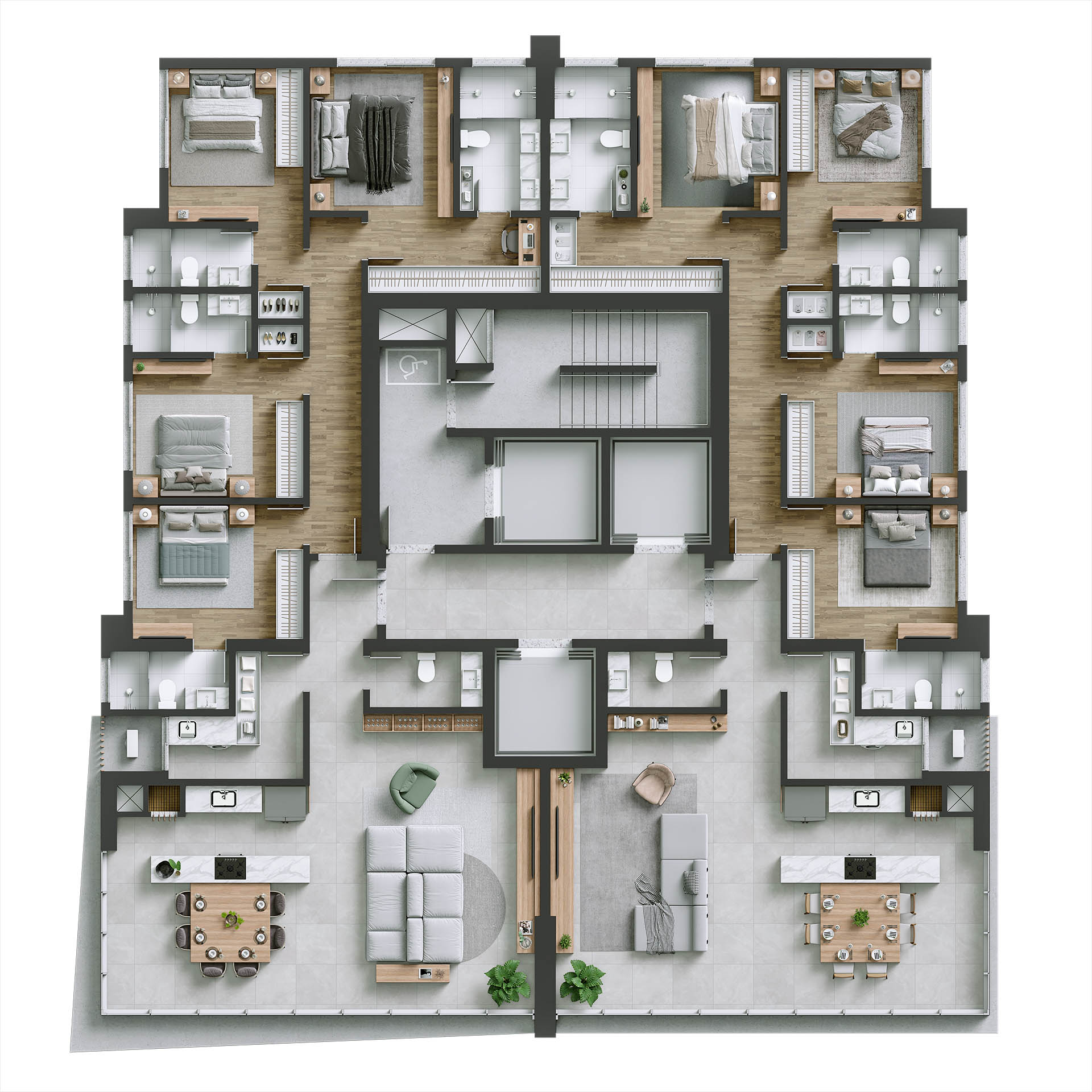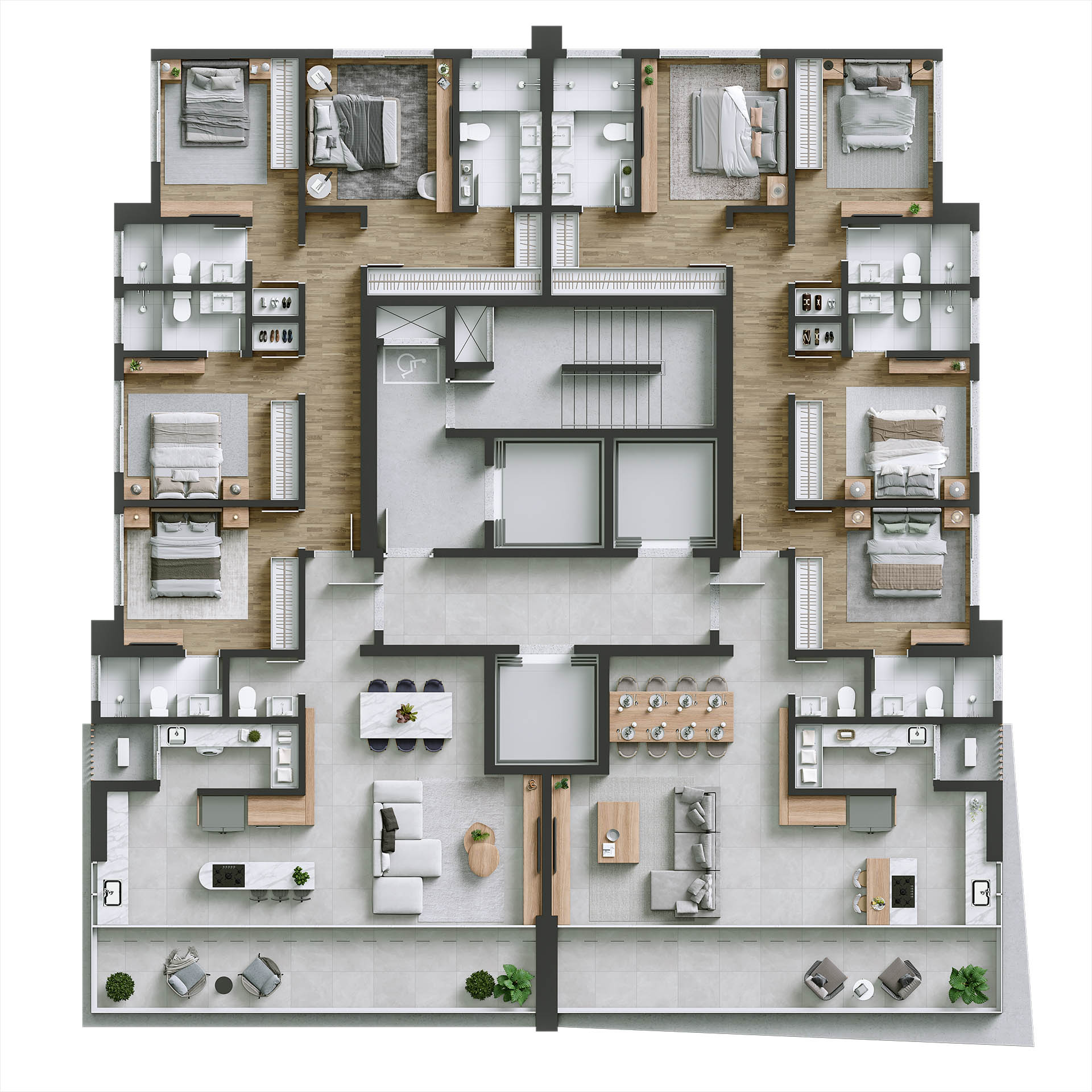 Os apartamentos garden do High Tower são ideais para quem busca espaço e exclusividade. Com áreas entre 210 m² e 375 m², oferecem 4 suítes, vagas de garagem e amplos terraços privativos. O design valoriza a integração entre os ambientes internos e externos, com acabamentos nobres e iluminação natural em todos os cômodos.