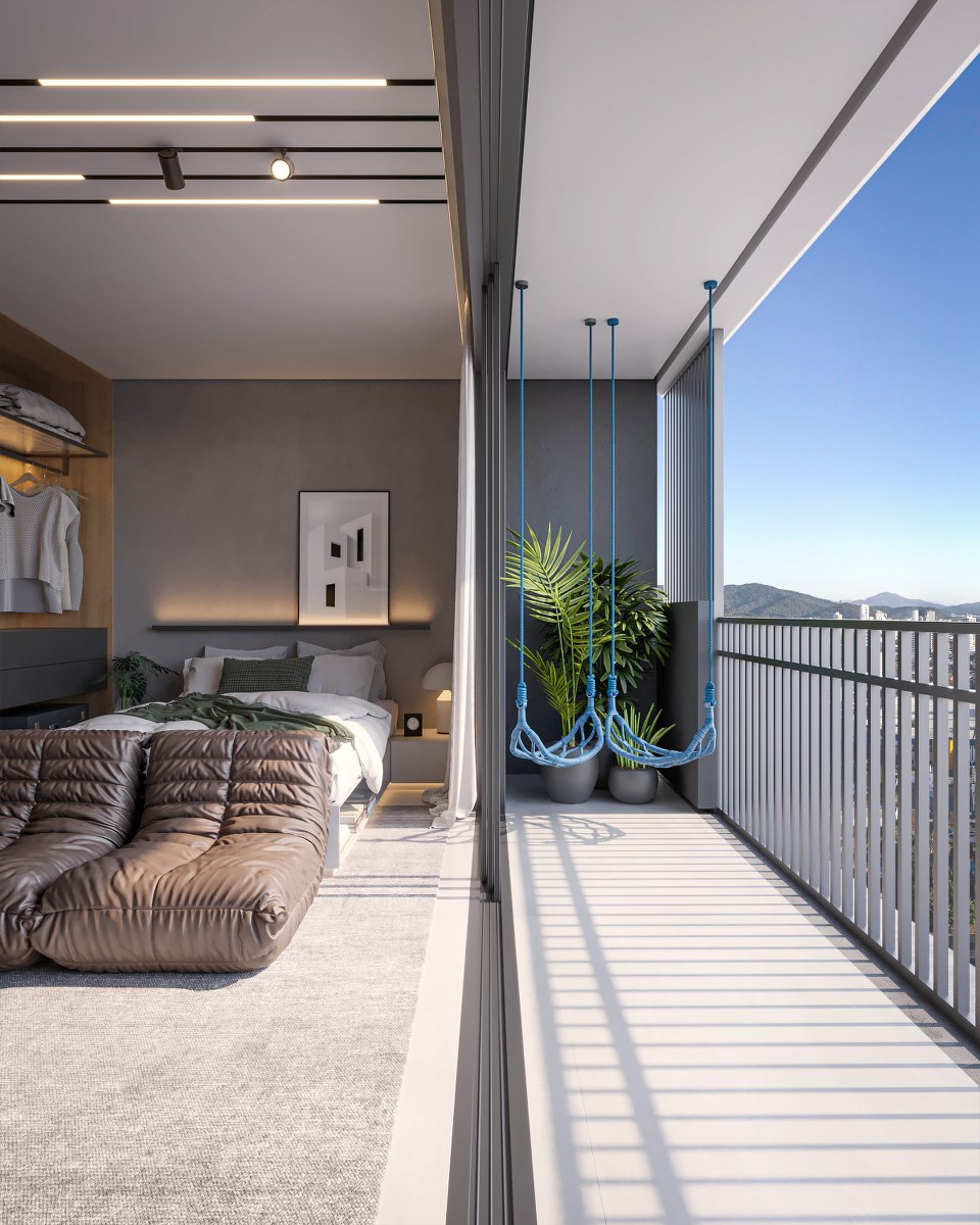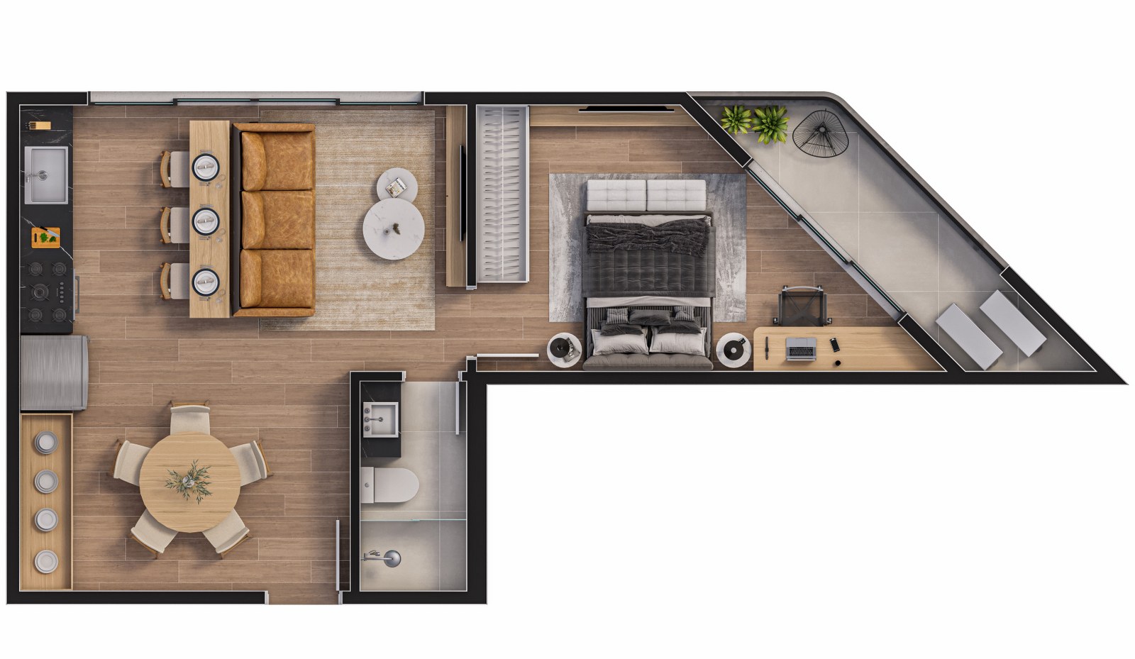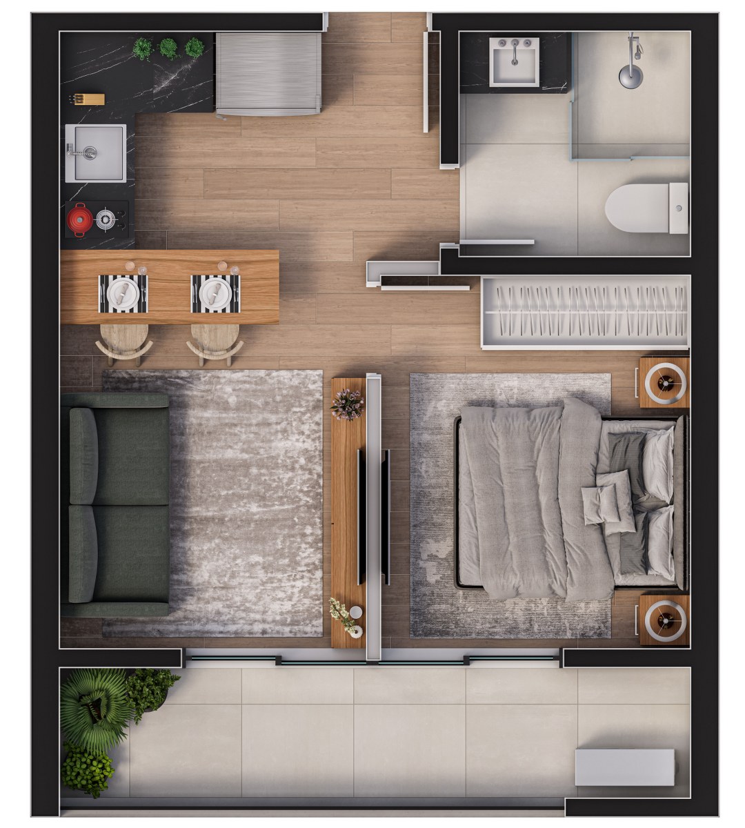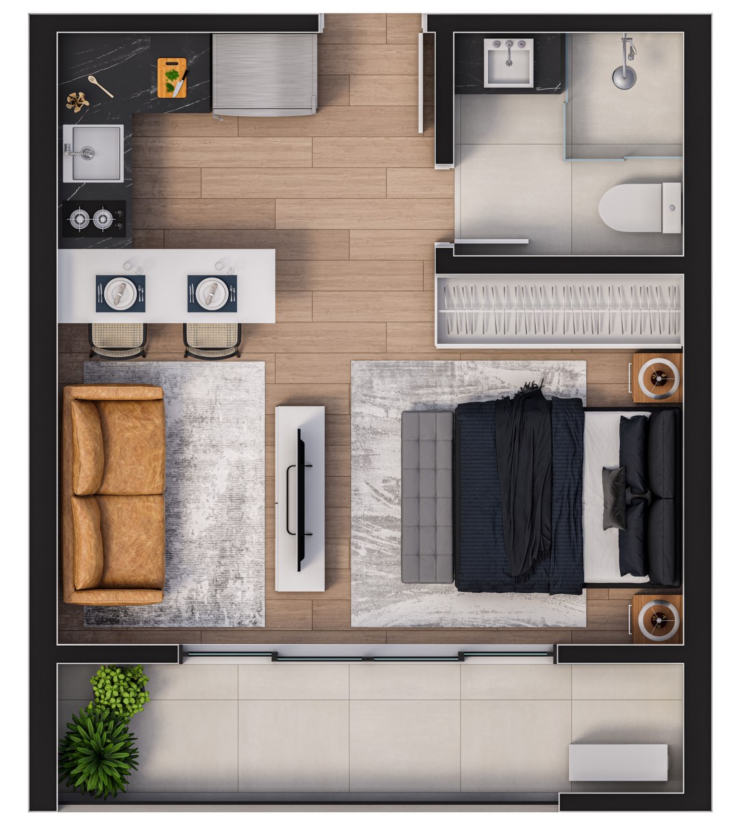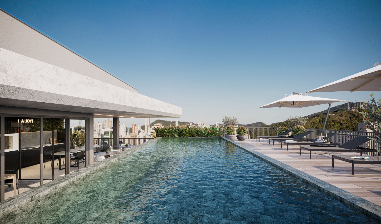 Os studios de 34 m² a 50 m² priorizam integração, eficiência e conforto acústico, com infraestrutura para automação, acesso digital e apoio de serviços pay per use no dia a dia. No rooftop, o lazer inclui piscina, espaços gourmets, coworking, lavanderia e academia, formando um ecossistema prático para morar e investir no Centro de Itajaí.