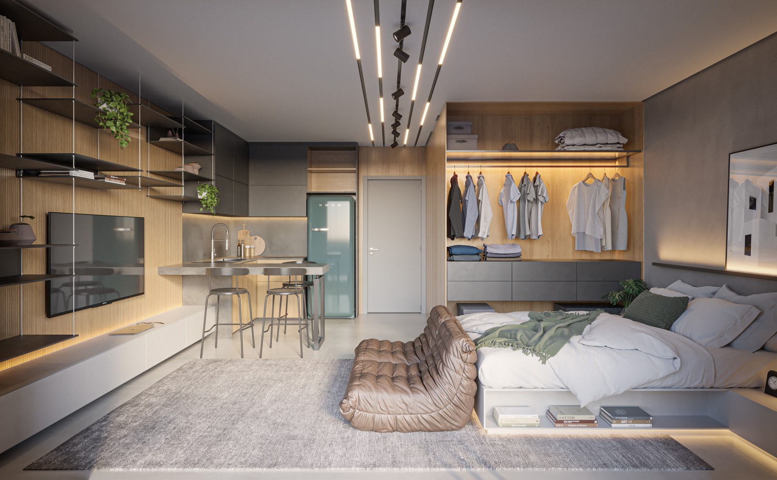Studios de 34 m² a 50 m² e apartamentos de 68 m² com 1 suíte + 1 dormitório, priorizando integração, tecnologia e conforto acústico.