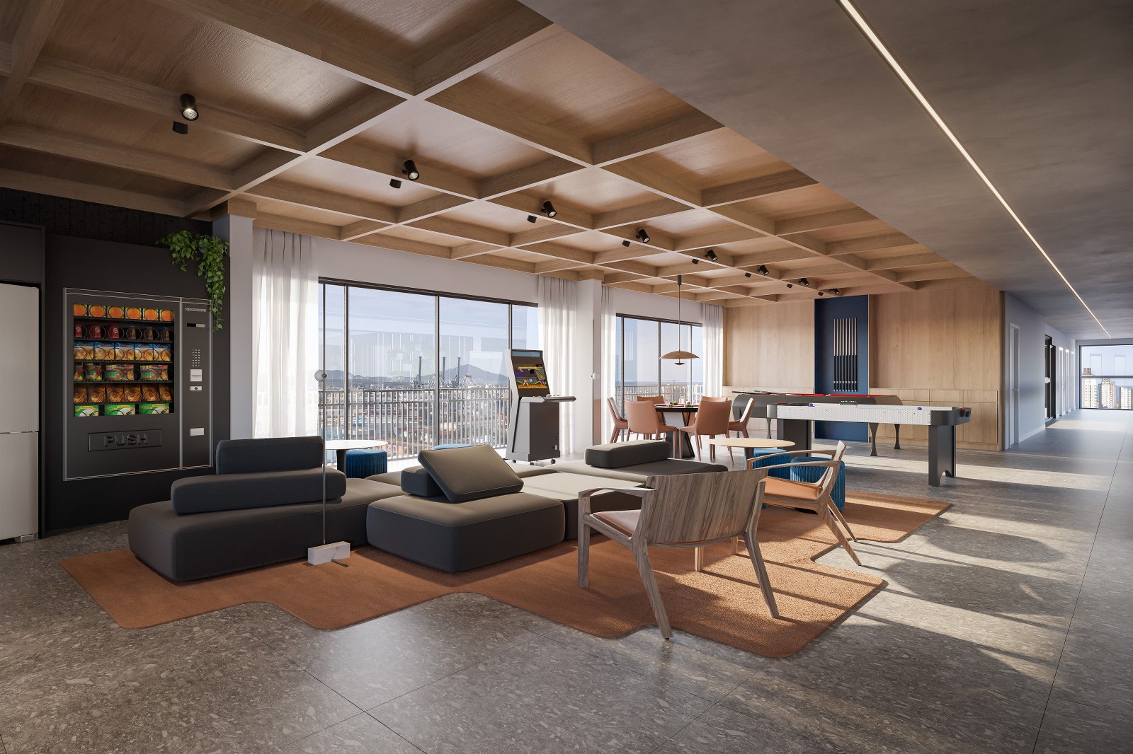 As tipologias contemplam studios entre 34 m² e 50 m² e apartamentos de 68 m² com 1 suíte + 1 dormitório, priorizando integração, ventilação e apoio de serviços no condomínio. Entre os diferenciais, destacam-se concierge, home market, guarda-entregas, CFTV, acesso digital, infraestrutura para automação e preparo para veículos elétricos, além de lazer completo no rooftop com piscina, academia e espaços gourmets.