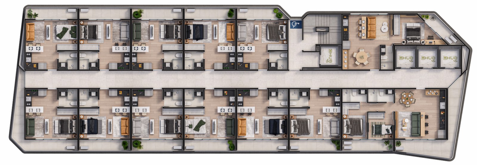 Hub 45 reúne studios de 34 a 50 m² e apartamentos de 68 m² (1 suíte + 1 dormitório), combinando lazer no rooftop, conveniências pay per use e infraestrutura tecnológica completa no Centro de Itajaí. Com acesso digital, isolamento acústico e automação, o empreendimento prioriza eficiência, conforto e serviços, ideal para viver, investir e trabalhar perto de tudo. Construtora responsável: CEG Empreendimentos.