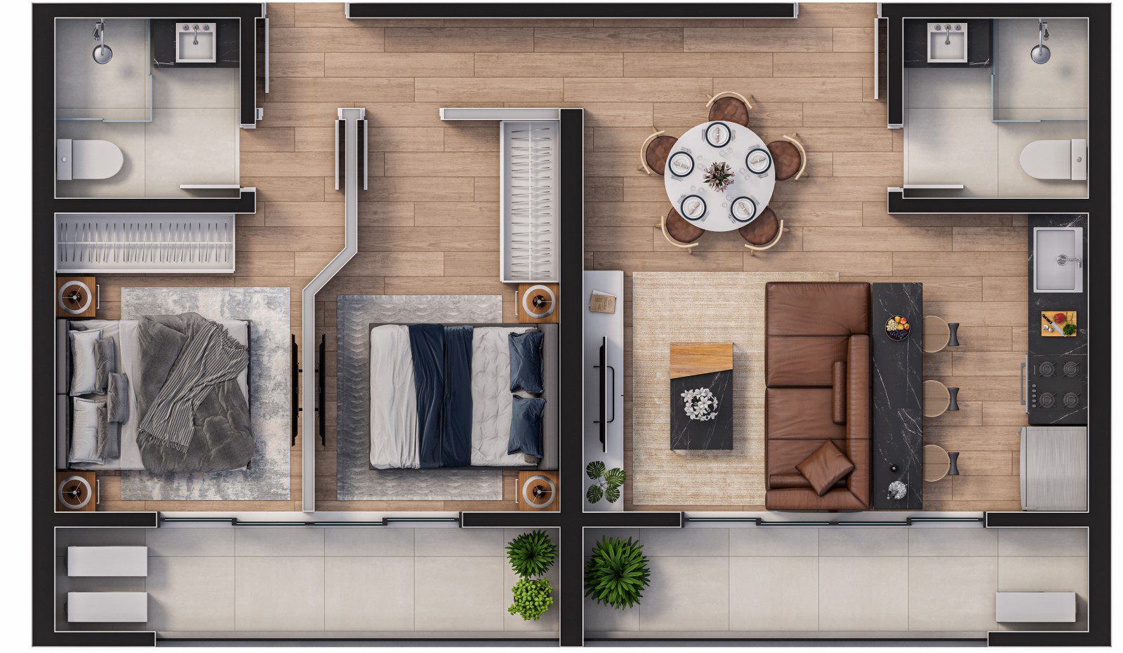 Os apartamentos de 68 m² oferecem 1 suíte + 1 dormitório, ambientes integrados, preparo para automação e isolamento acústico, pensando no conforto diário. A infraestrutura tecnológica inclui acesso digital, água quente central e CFTV, com conveniências no condomínio e lazer no rooftop para uma rotina prática.