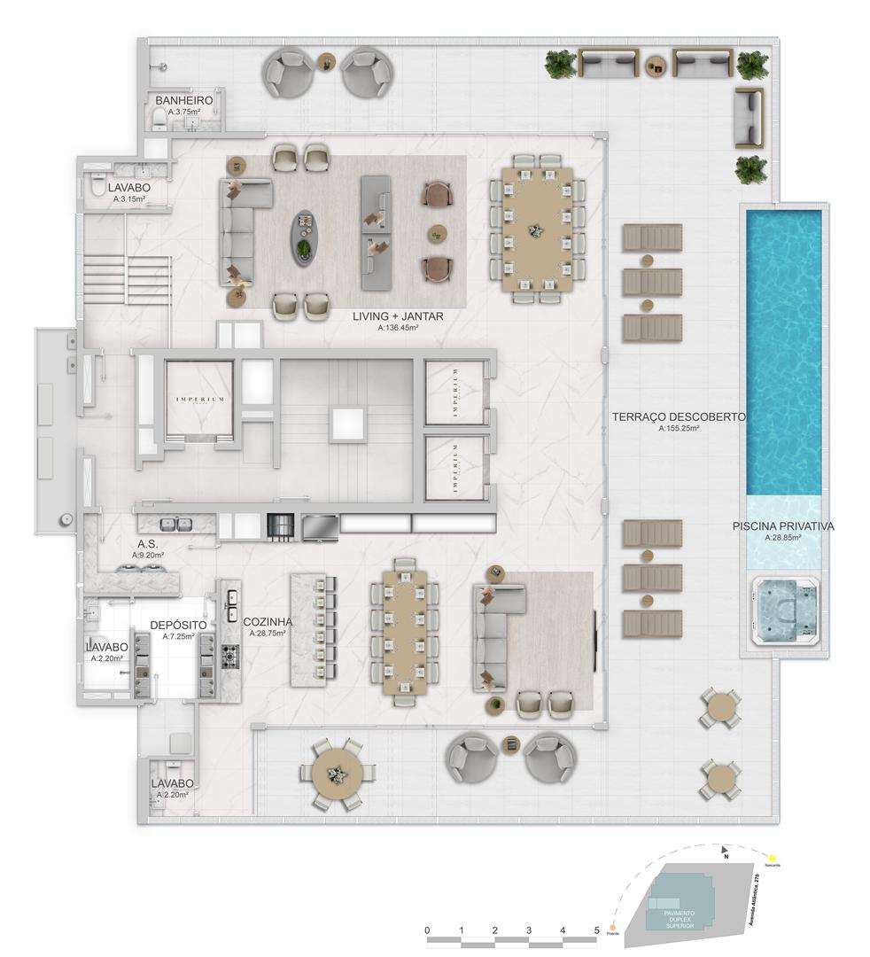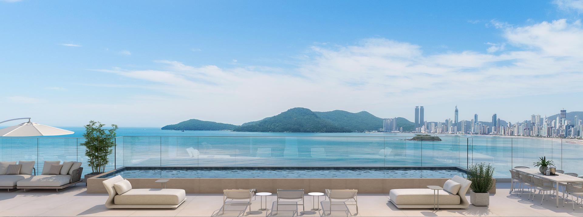 A cobertura duplex do Imperium Tower oferece 872 m² distribuídos em 9 suítes, com 3 a 6 vagas de garagem. O terraço possui piscina e spa, além de churrasqueira a carvão e ampla área social. A distribuição interna combina amplitude e privacidade, com acabamentos refinados e uma vista contínua do mar, reforçando a exclusividade dessa unidade.