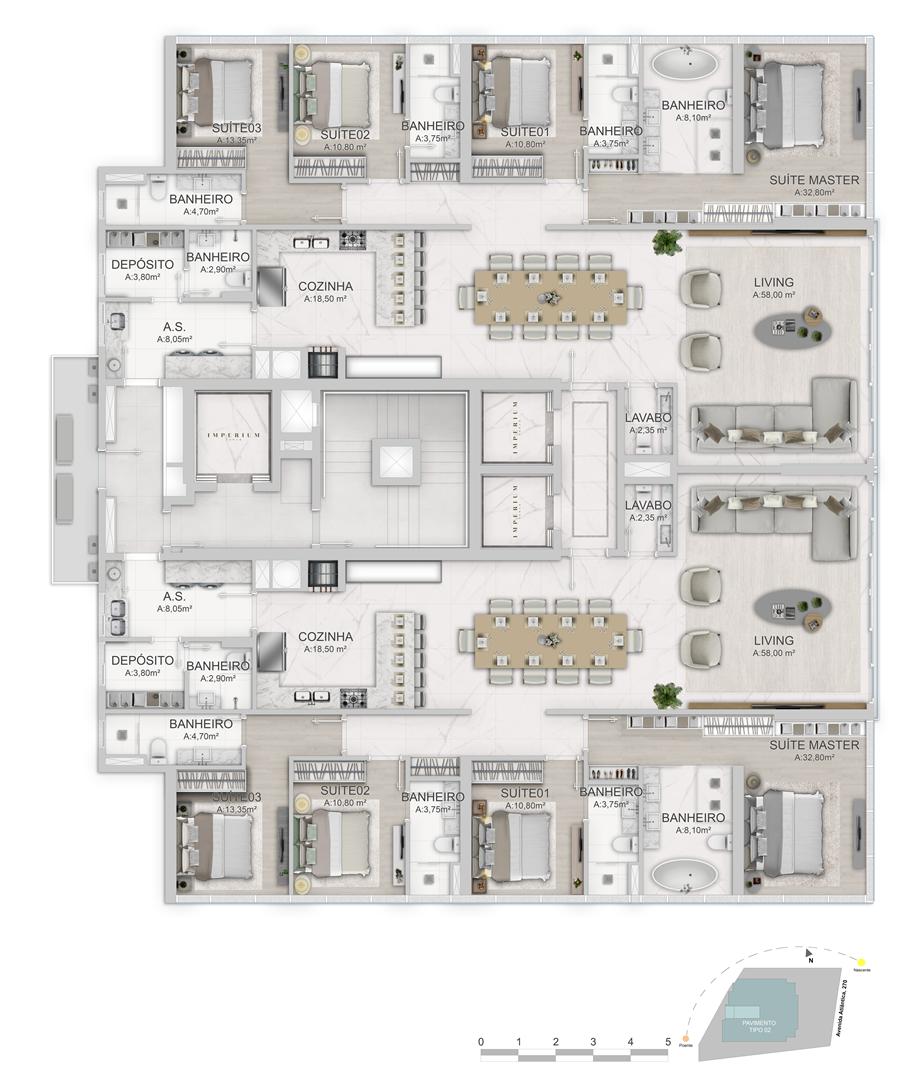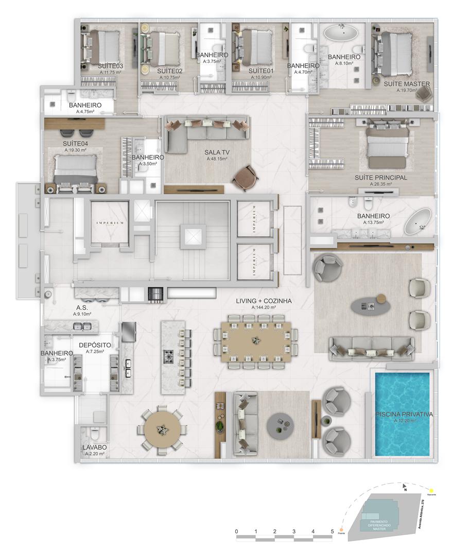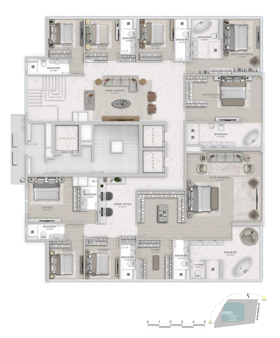 As mansões suspensas do Imperium Tower variam entre 380 m² a 634 m², todas com 6 suítes e 3 a 6 vagas de garagem. Os destaques ficam para o terraço privativo com piscina e spa, além do espaço gourmet integrado. Com acabamento premium e ambientes generosos, essa tipologia proporciona sensação de casa suspensa, somando conforto, privacidade e amplitude.