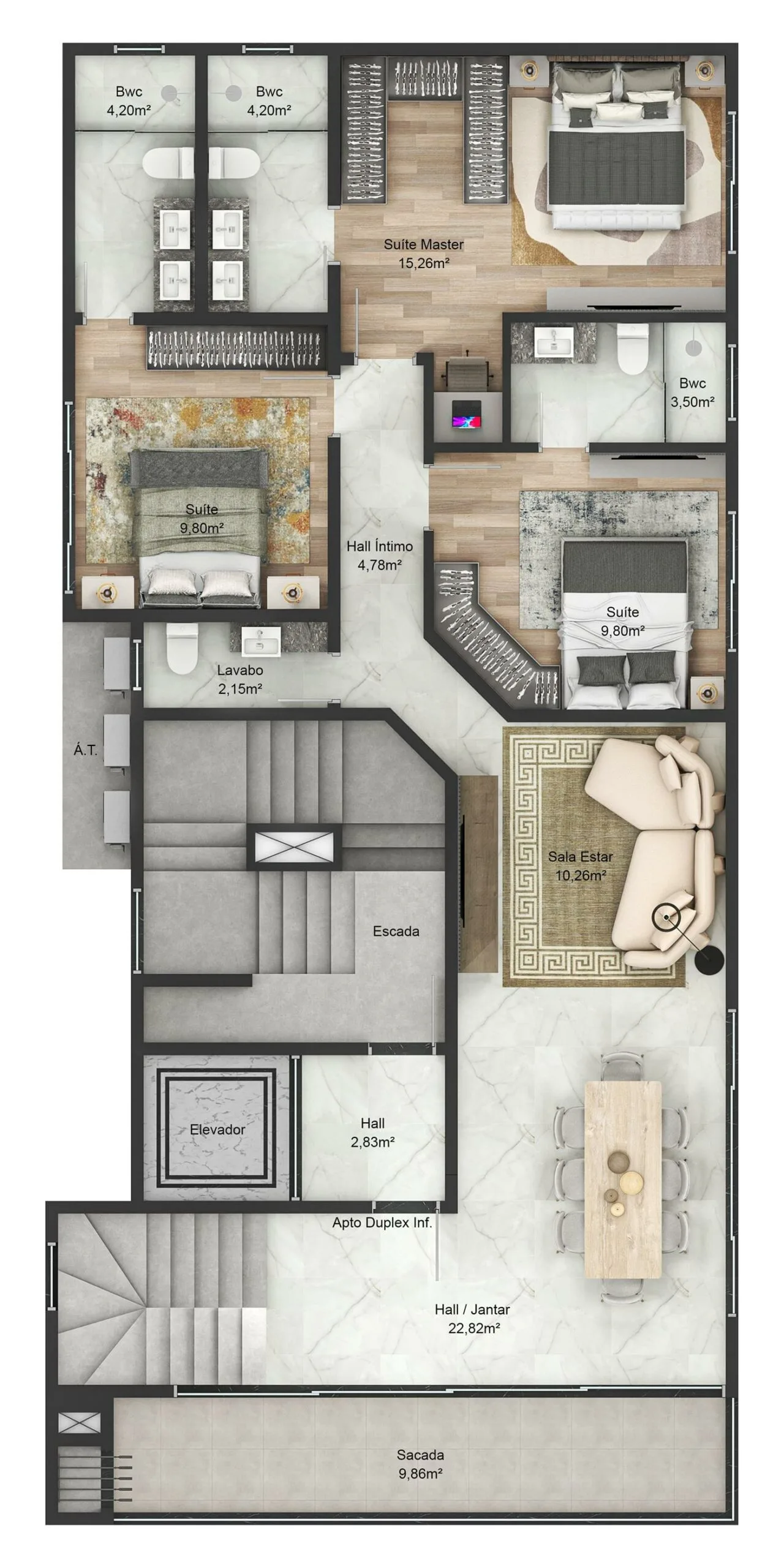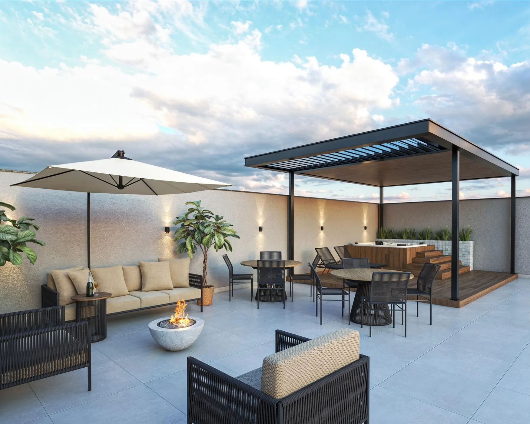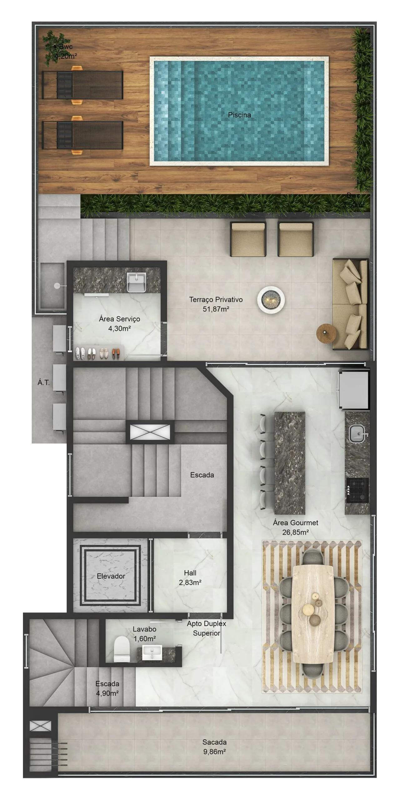 As unidades diferenciadas oferecem 219,40 m² de área privativa, incluindo um terraço privativo de 108 m². Possuem 3 suítes, lavabo, área de serviço, living espaçoso e sacada integrada à cozinha com churrasqueira. A área externa é ideal para criar um ambiente gourmet ou espaço de lazer privativo. Acabamentos sofisticados e estrutura completa complementam a experiência.