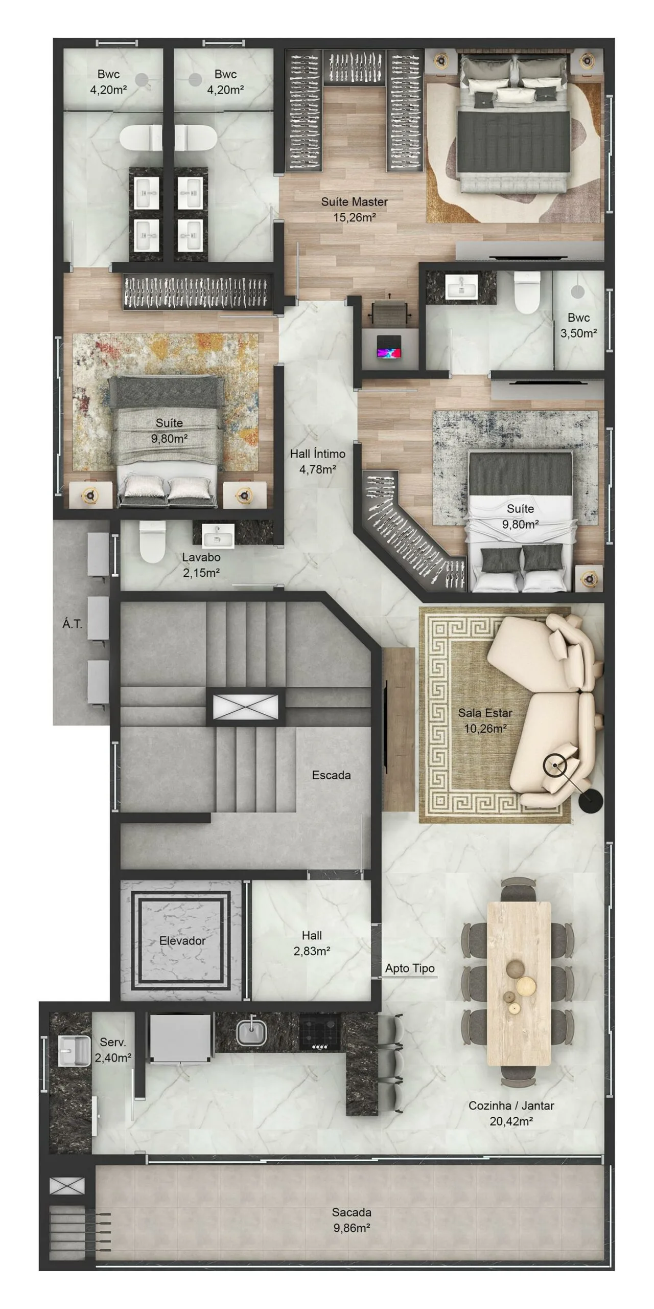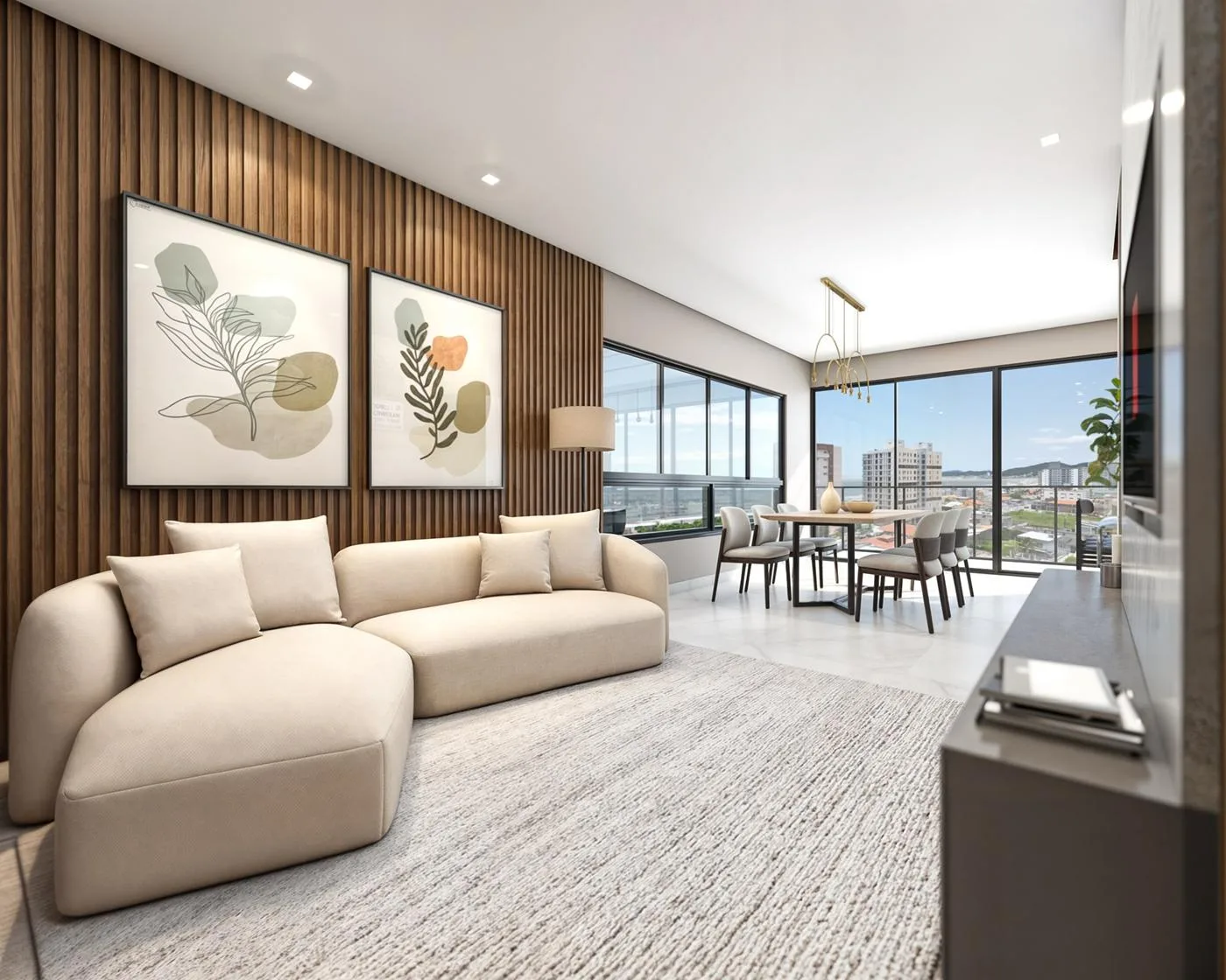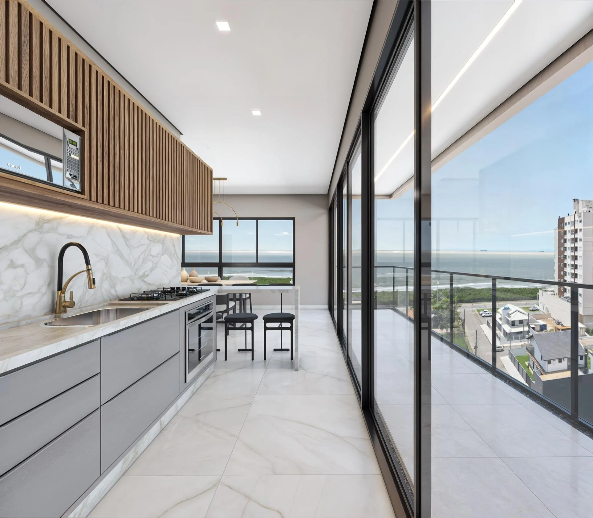 Os apartamentos tipo contam com 111,84 m² de área privativa, 3 dormitórios sendo todos suítes, além de lavabo e área de serviço independente. O living é integrado à sacada com churrasqueira e à cozinha americana, proporcionando amplitude e funcionalidade. Os ambientes contam com acabamento em gesso, porcelanato e infraestrutura para água quente, split e gás individual.