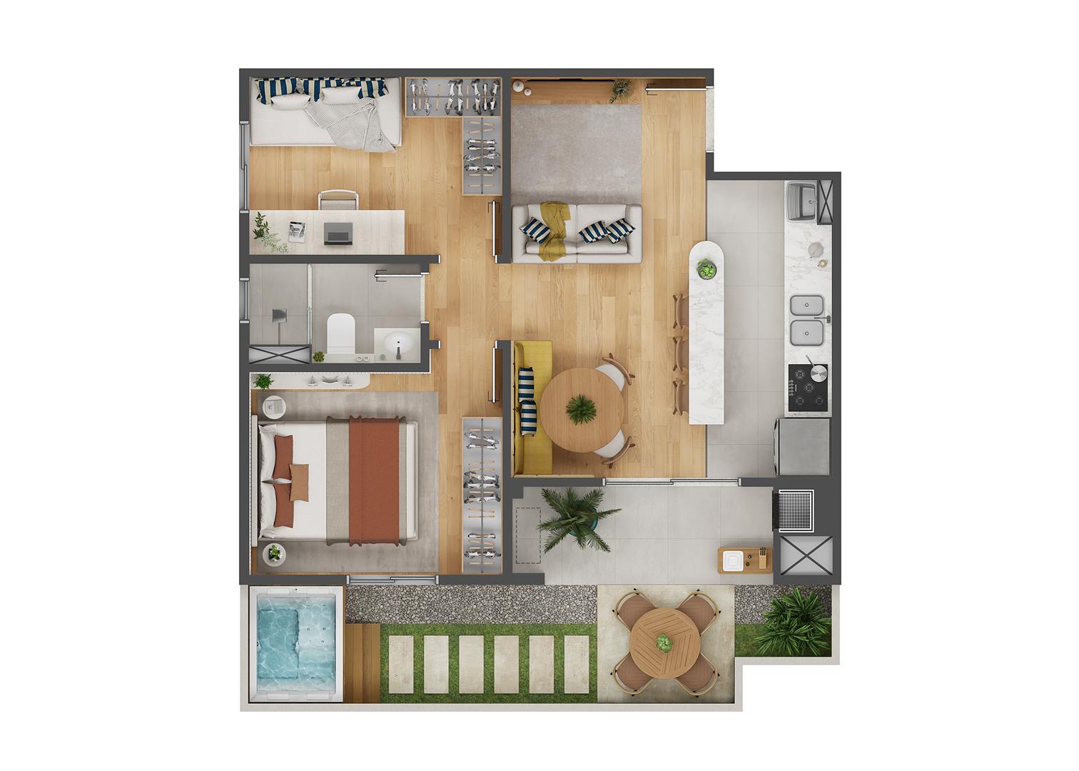 As unidades Garden (Giardino) do Itajuba Casamar combinam praticidade e exclusividade, oferecendo áreas privativas externas entre 11,97 m² e 29,80 m², ideais para momentos de lazer ao ar livre. São opções com 2 dormitórios, sacada com churrasqueira e até 78,70 m² de área total.
