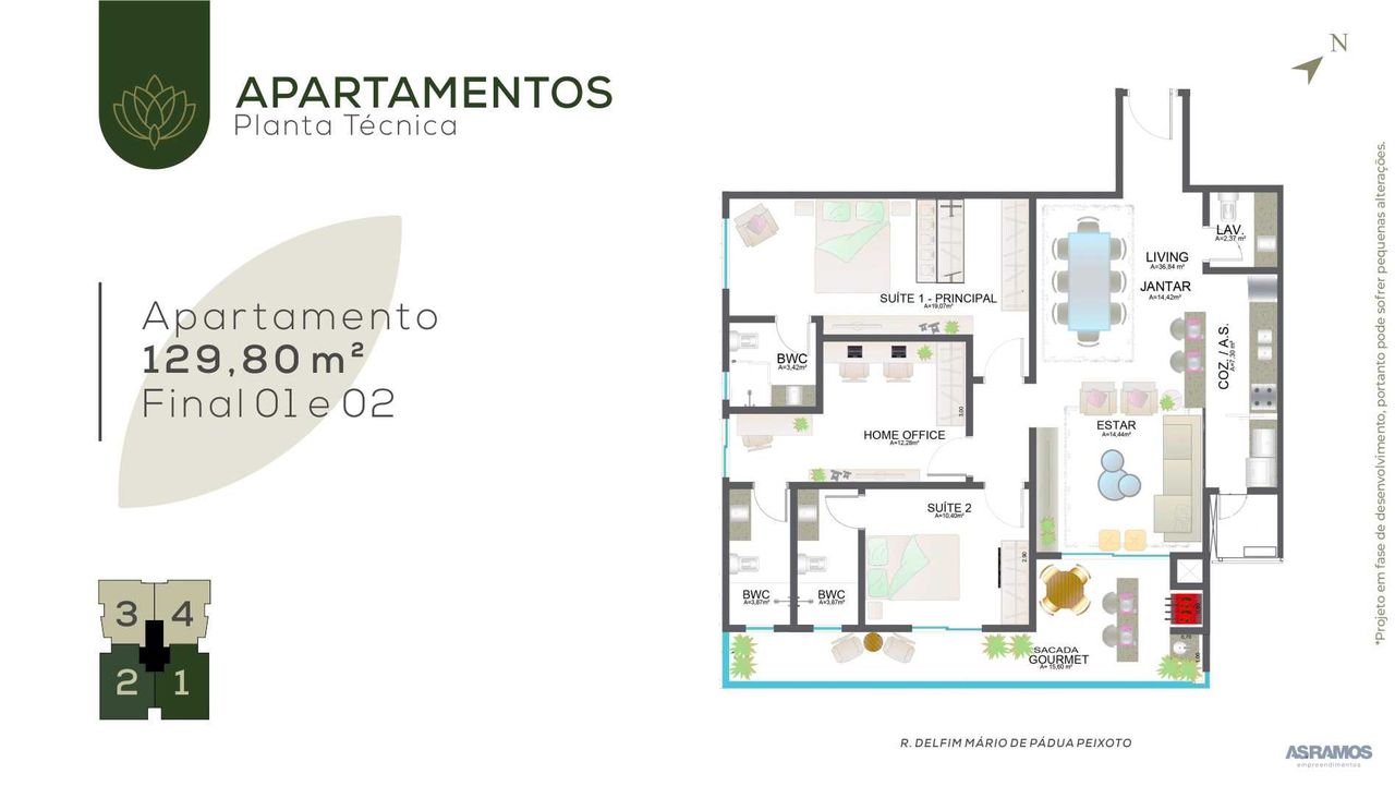 O Jardins da Brava oferece apartamentos com 02 a 04 suítes, com áreas privativas que variam de 129,80 m² a 215,65 m².