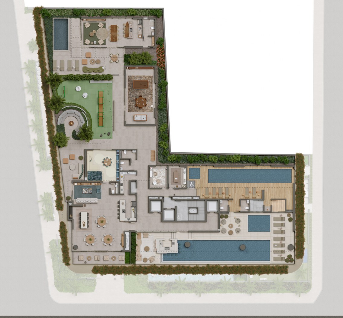 Com lazer completo de resort urbano, o condomínio combina áreas internas e externas para bem-estar em todas as estações, com piscinas aquecidas e térmicas, espaços gourmets, spa, saunas e ambientes para família, fitness e pets, além de acessos funcionais para vida à beira-mar.
