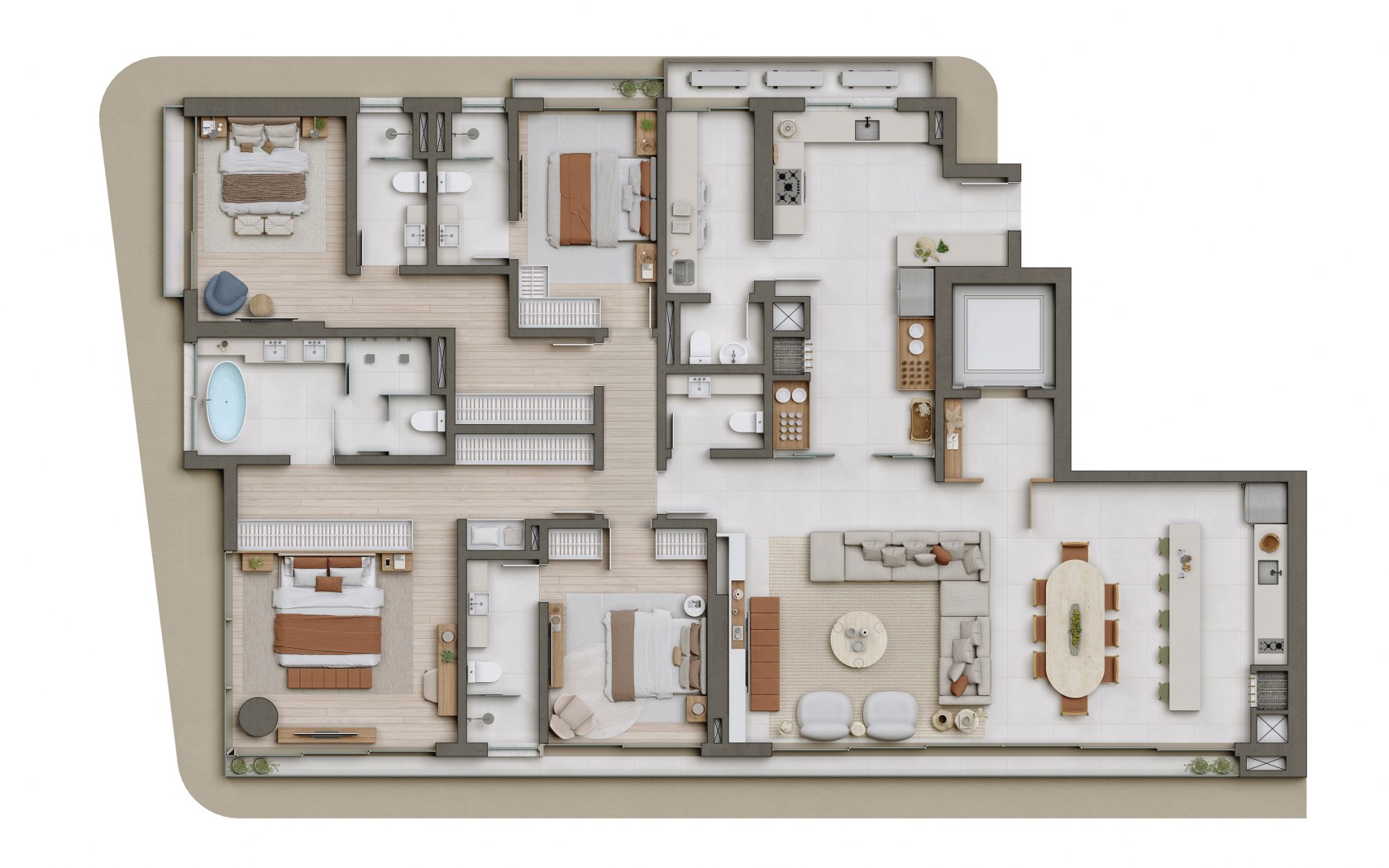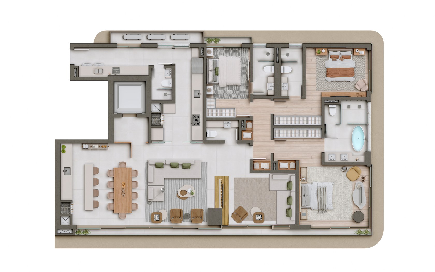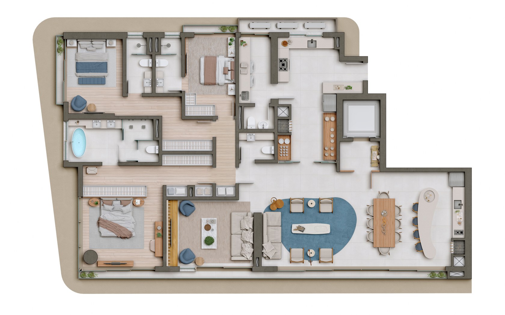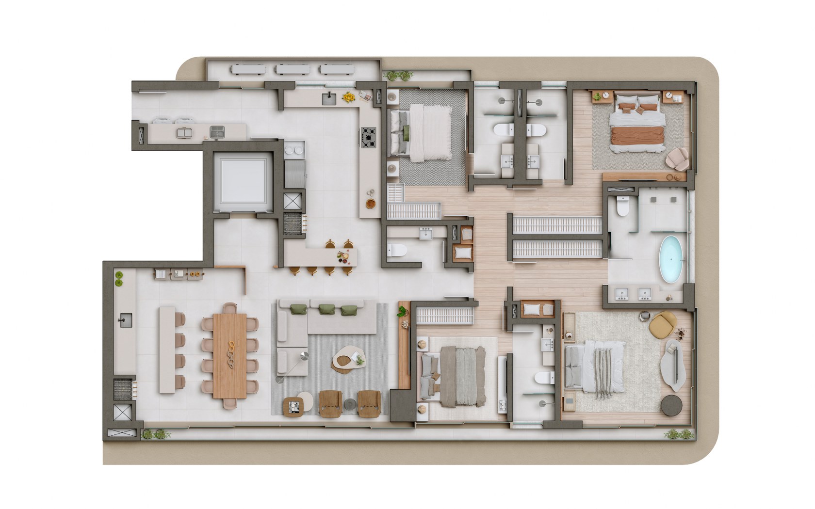Os apartamentos oferecem 217,80 m² privativos, com 3 suítes, 2 vagas e plantas que favorecem living integrado, cozinha funcional, varanda com churrasqueira e acabamentos como gesso e porcelanato, garantindo conforto e estética contemporânea para uso cotidiano e receber com elegância.