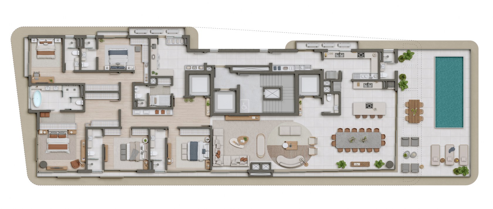 A cobertura de 460,47 m² oferece amplitude para integrar living, terraço e áreas de lazer privativas, com potencial para espaço gourmet, churrasqueira e hidromassagem, mantendo o mesmo padrão de acabamentos, conforto e integração presentes nas demais tipologias do empreendimento.