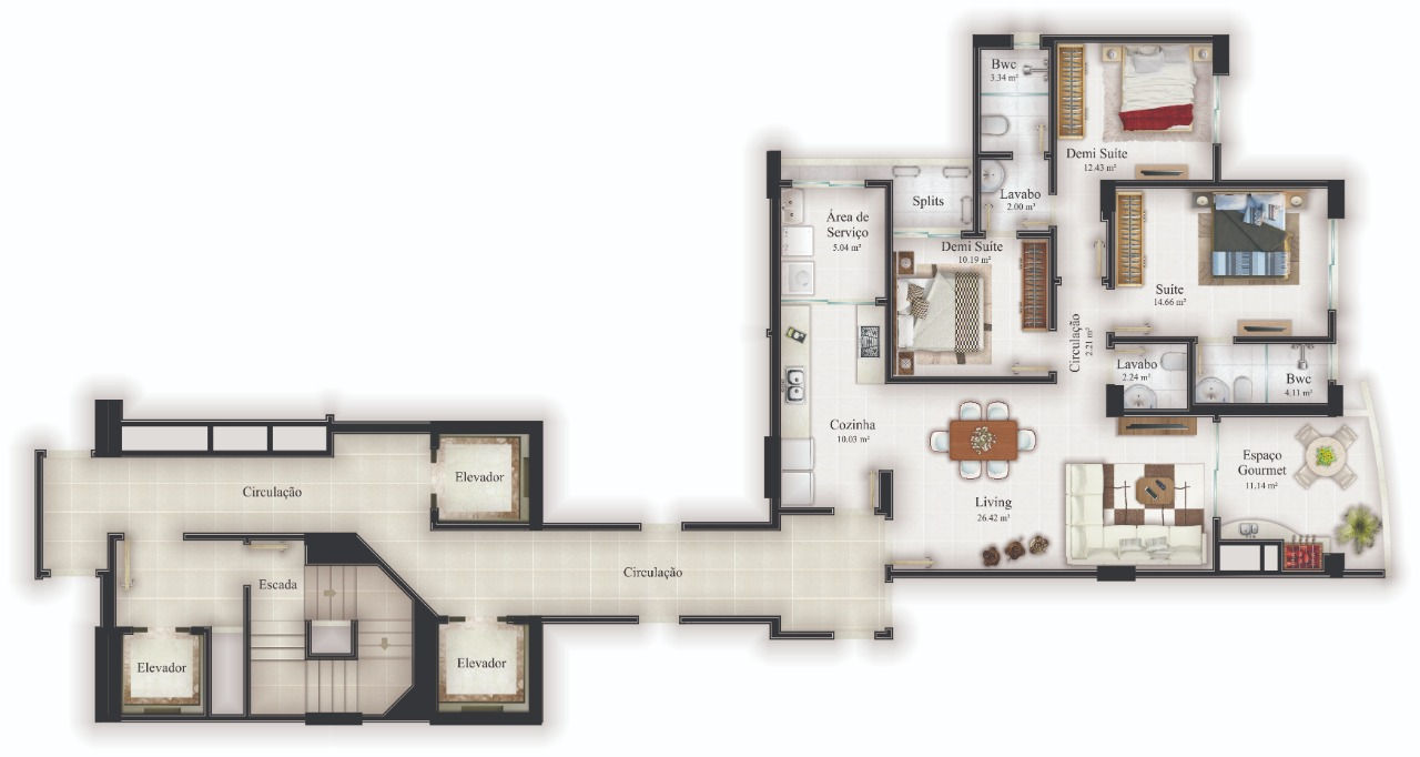 O projeto apresenta arquitetura moderna, áreas amplas e integração entre os ambientes, com sacadas gourmet em todas as unidades.