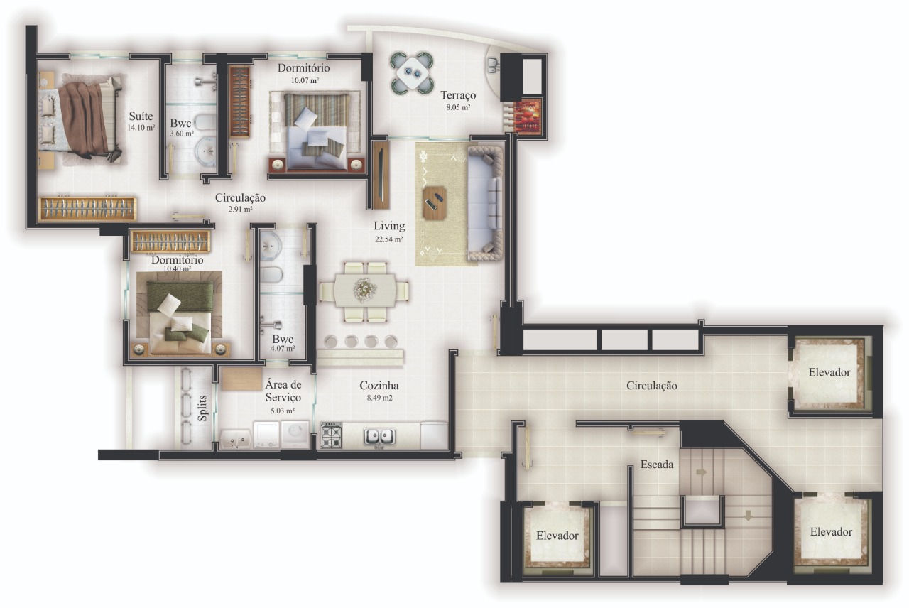 O empreendimento oferece apartamentos com metragens entre 90 m² e 123 m², com opções de 2 a 3 dormitórios e até 3 suítes.