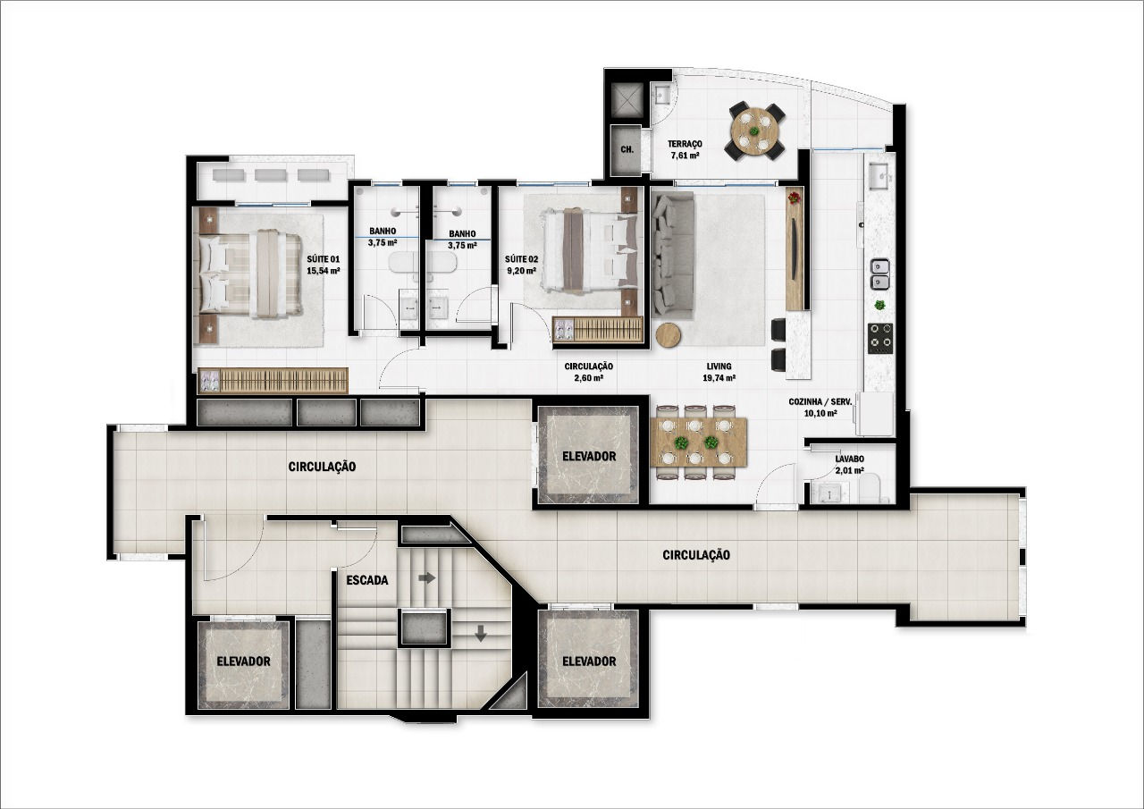 Os acabamentos seguem padrão premium, com atenção aos detalhes, integração de ambientes e espaços que priorizam conforto e iluminação natural.