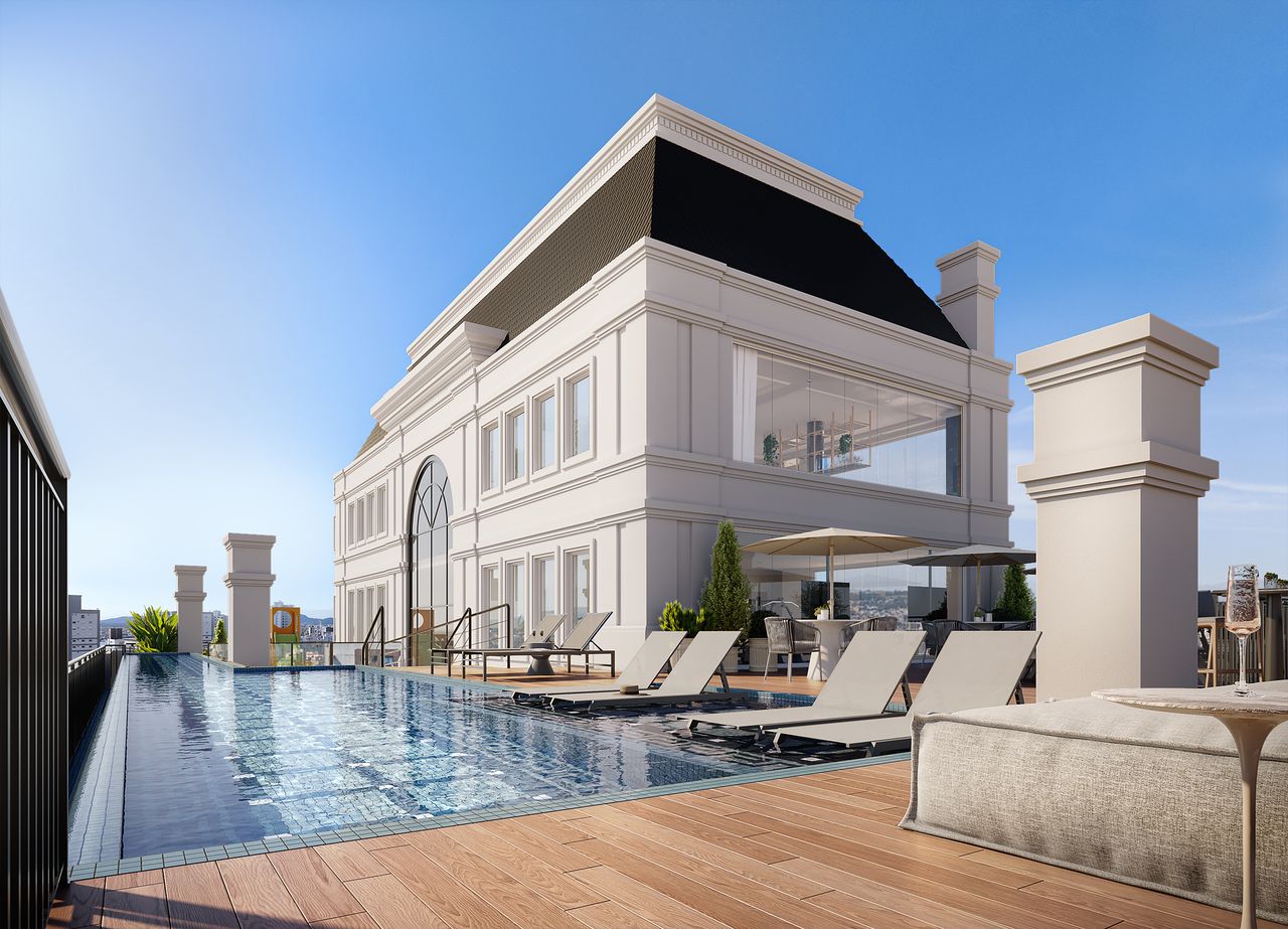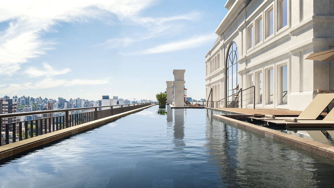 O rooftop conta com Piscina adulto com borda infinita, Pub, Solarium e Espaço gourmet.