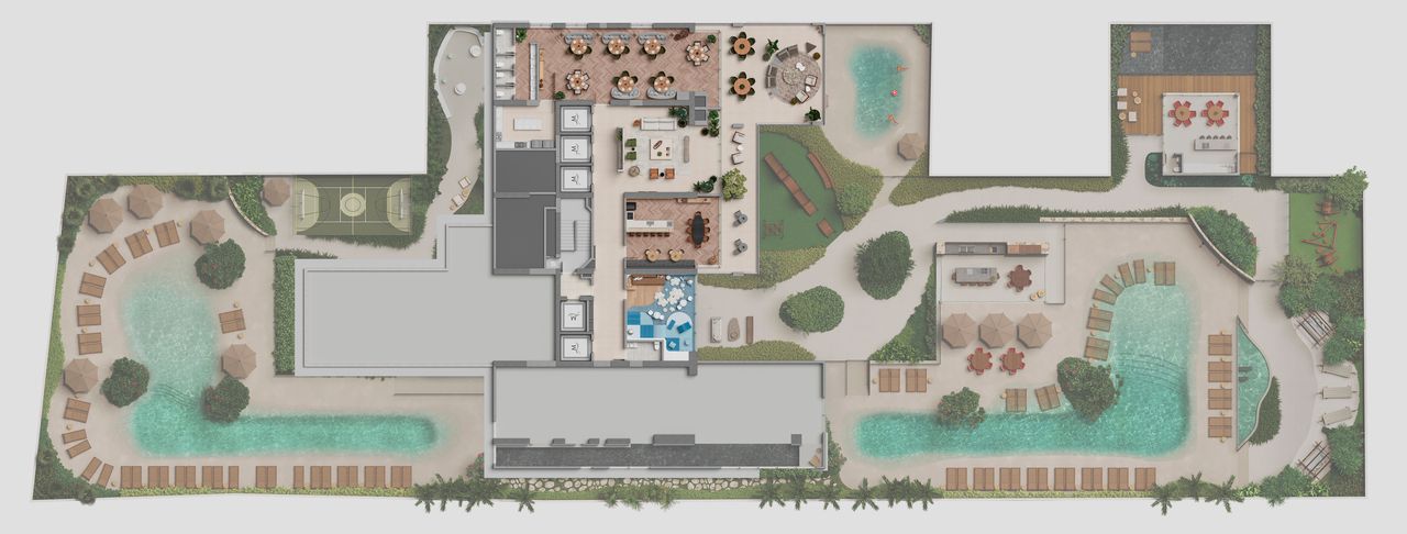 O Marena conta com mais de 20 espaços de lazer, incluindo piscinas, spa, academia, salão de festas e áreas de convivência.