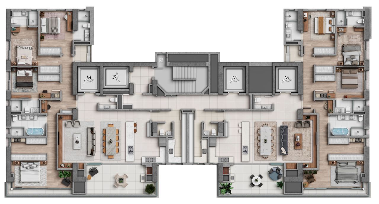 Os apartamentos do Marena oferecem uma distribuição inteligente dos espaços, com acabamentos de alta qualidade e áreas exclusivas. Os imóveis possuem 4 suítes, sendo uma master, e variam em metragem, garantindo opções para diferentes necessidades.