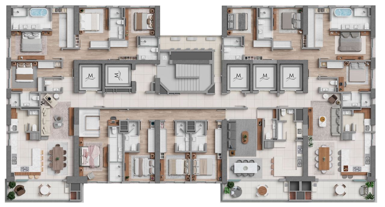 Os apartamentos do Marena variam em metragens e tipologias, com opções que atendem diferentes perfis de investidores. Os imóveis possuem 4 suítes, áreas privativas que vão de 171,66 m² a 283,56 m², e 3 vagas de garagem, proporcionando conforto e exclusividade.