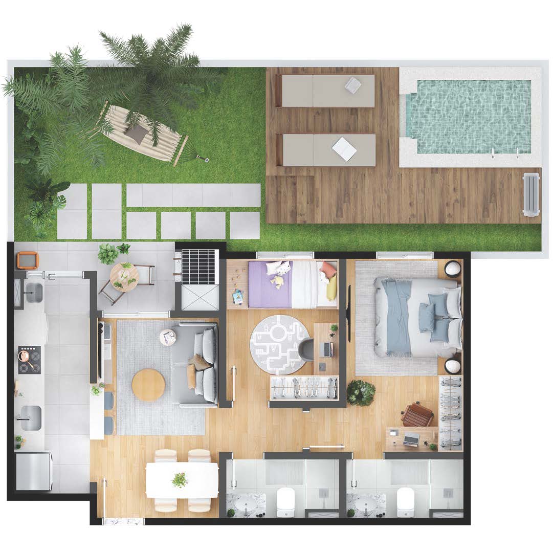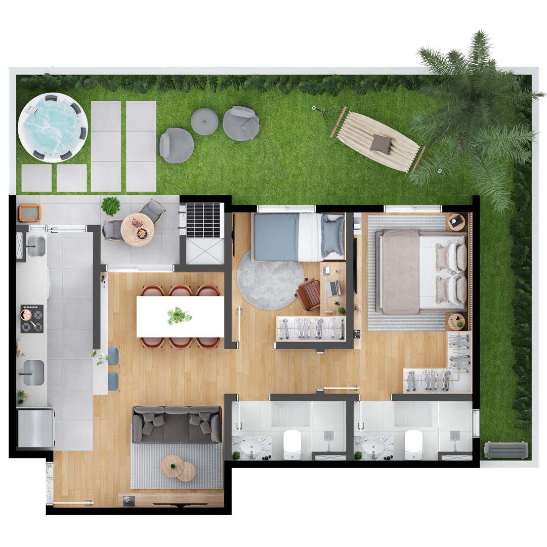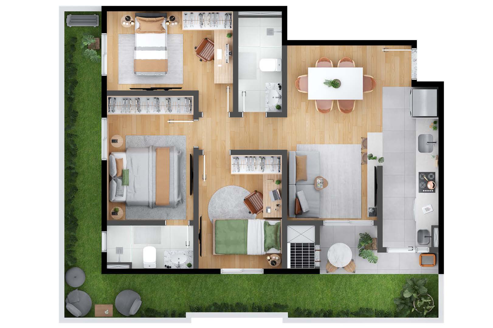 Os gardens do Meo Anita são perfeitos para quem deseja mais espaço e área externa privativa. Com opções de 2 ou 3 dormitórios com suíte e metragens que vão de 65 m² a 102 m², as unidades oferecem o conforto de uma casa aliado à segurança de um condomínio.