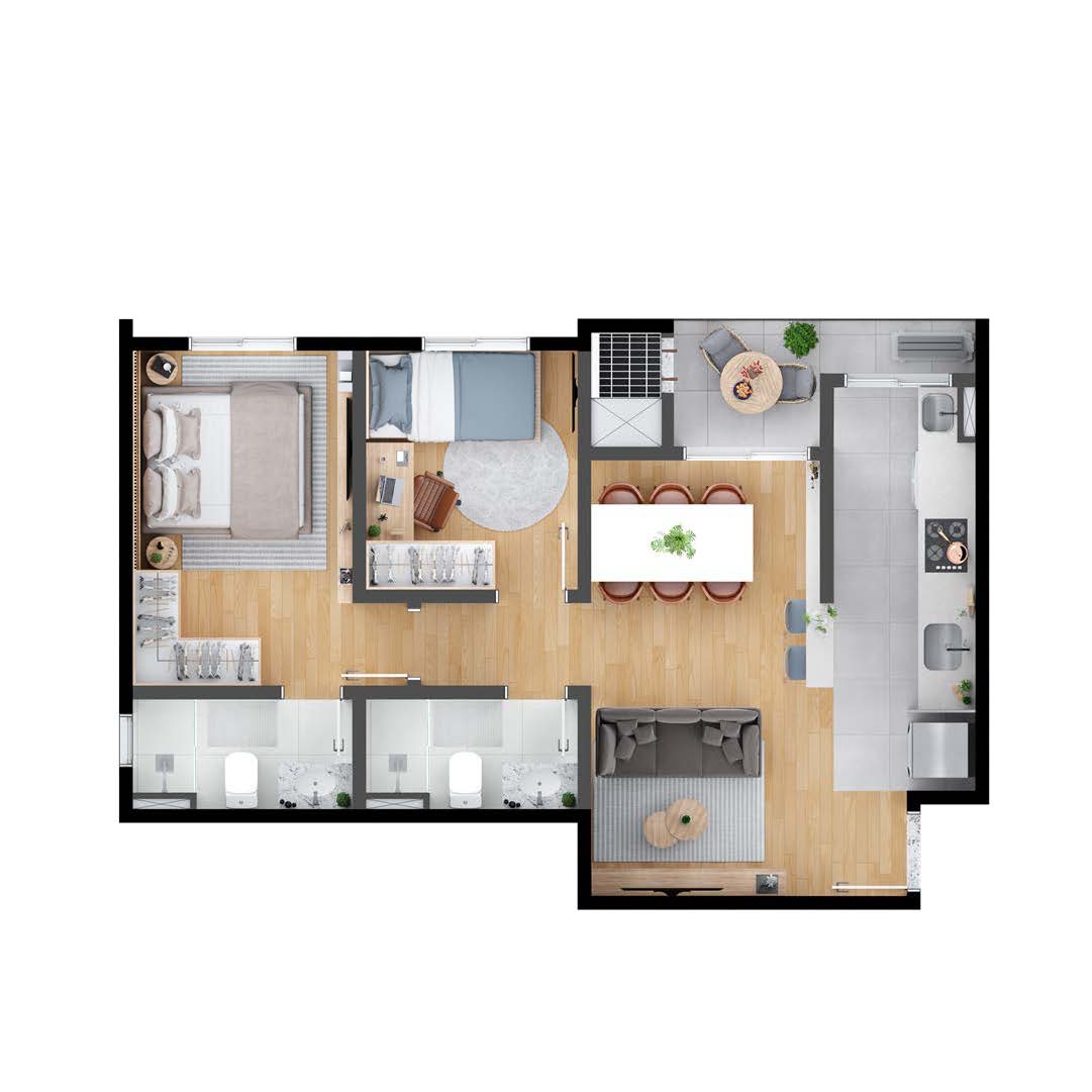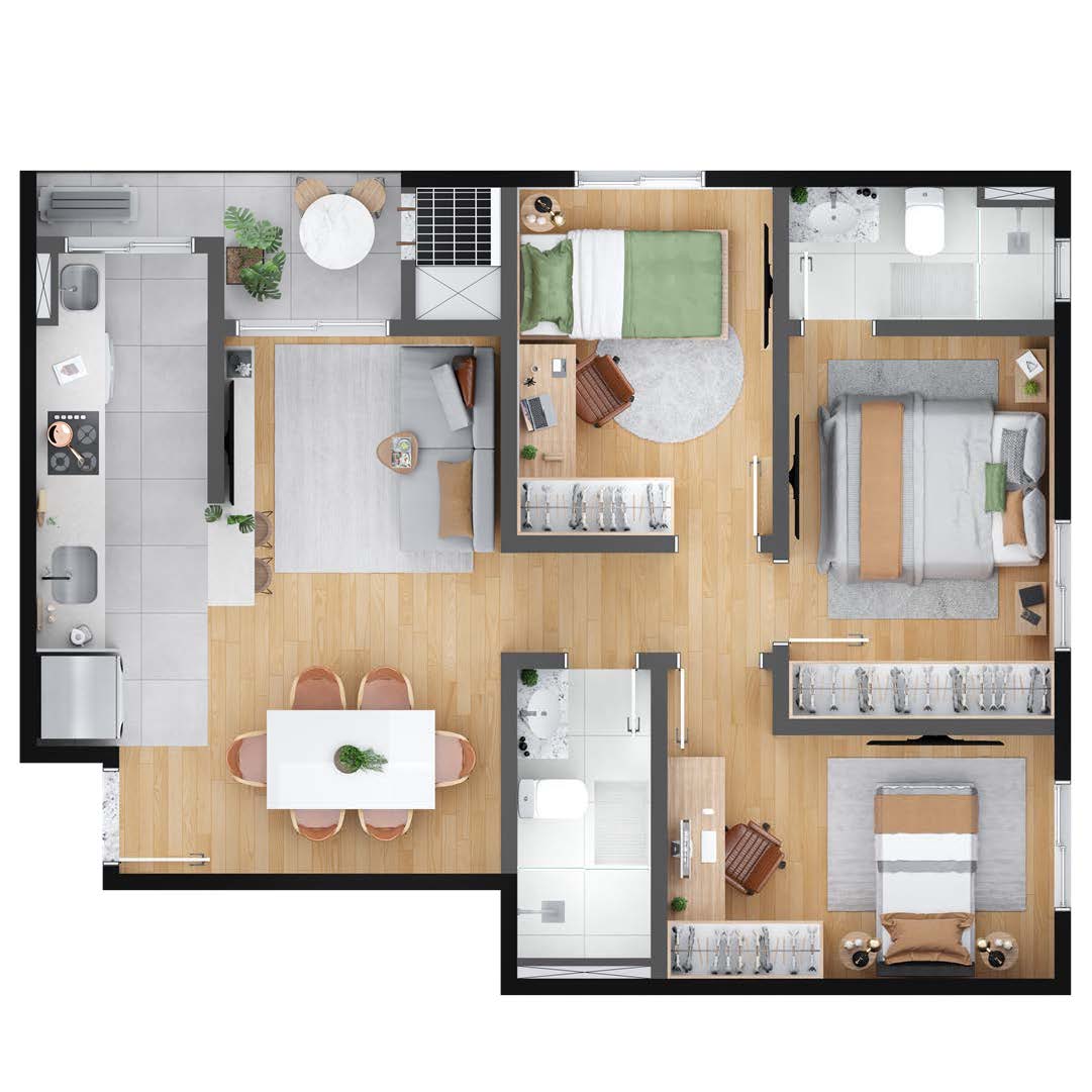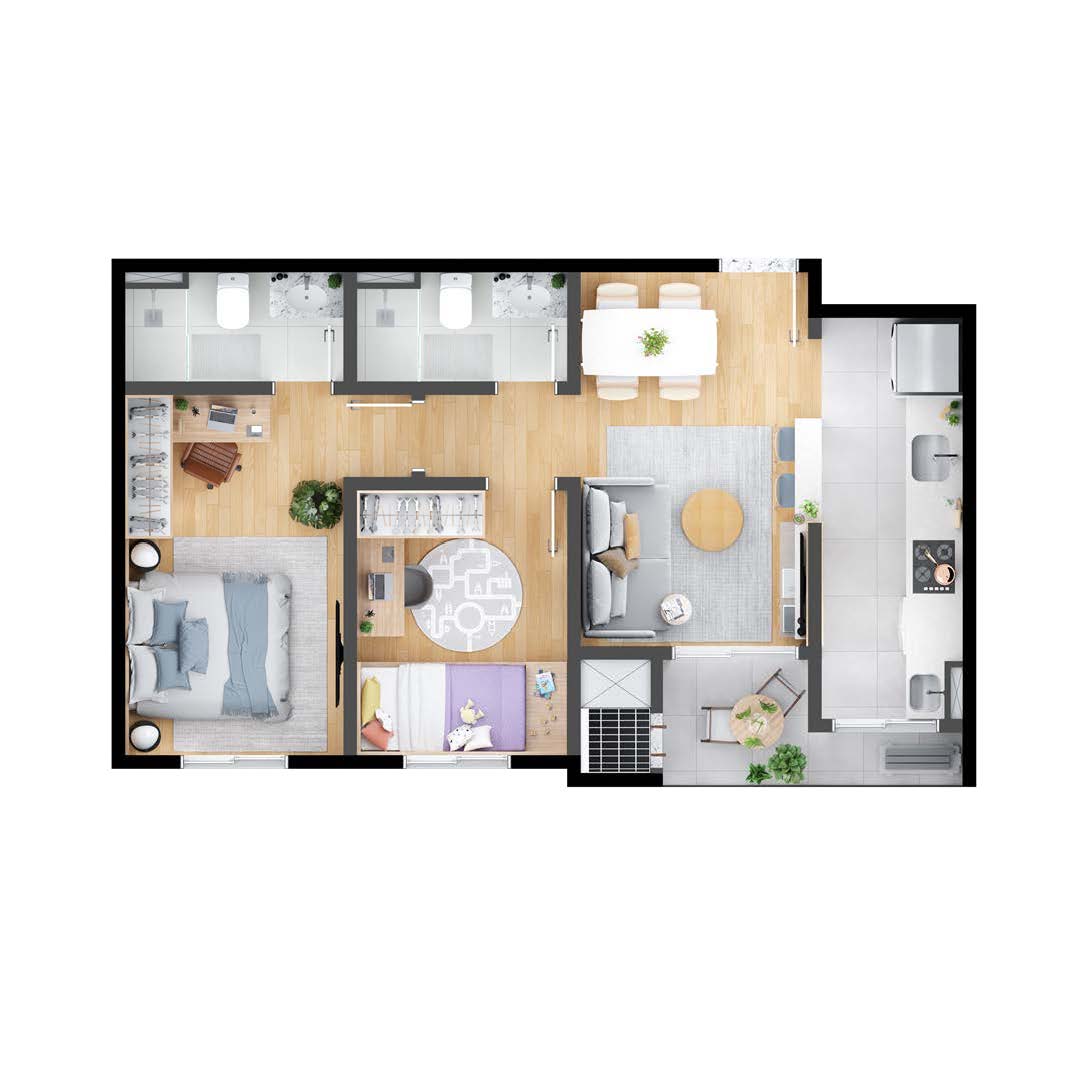 Os apartamentos do Meo Anita contam com metragens entre 52 m² e 63 m², oferecendo 2 ou 3 dormitórios com suíte. Cada unidade dispõe de varanda com churrasqueira, integração entre cozinha e sala e infraestrutura para ar-condicionado. Ideais para quem busca funcionalidade e conforto em Joinville.