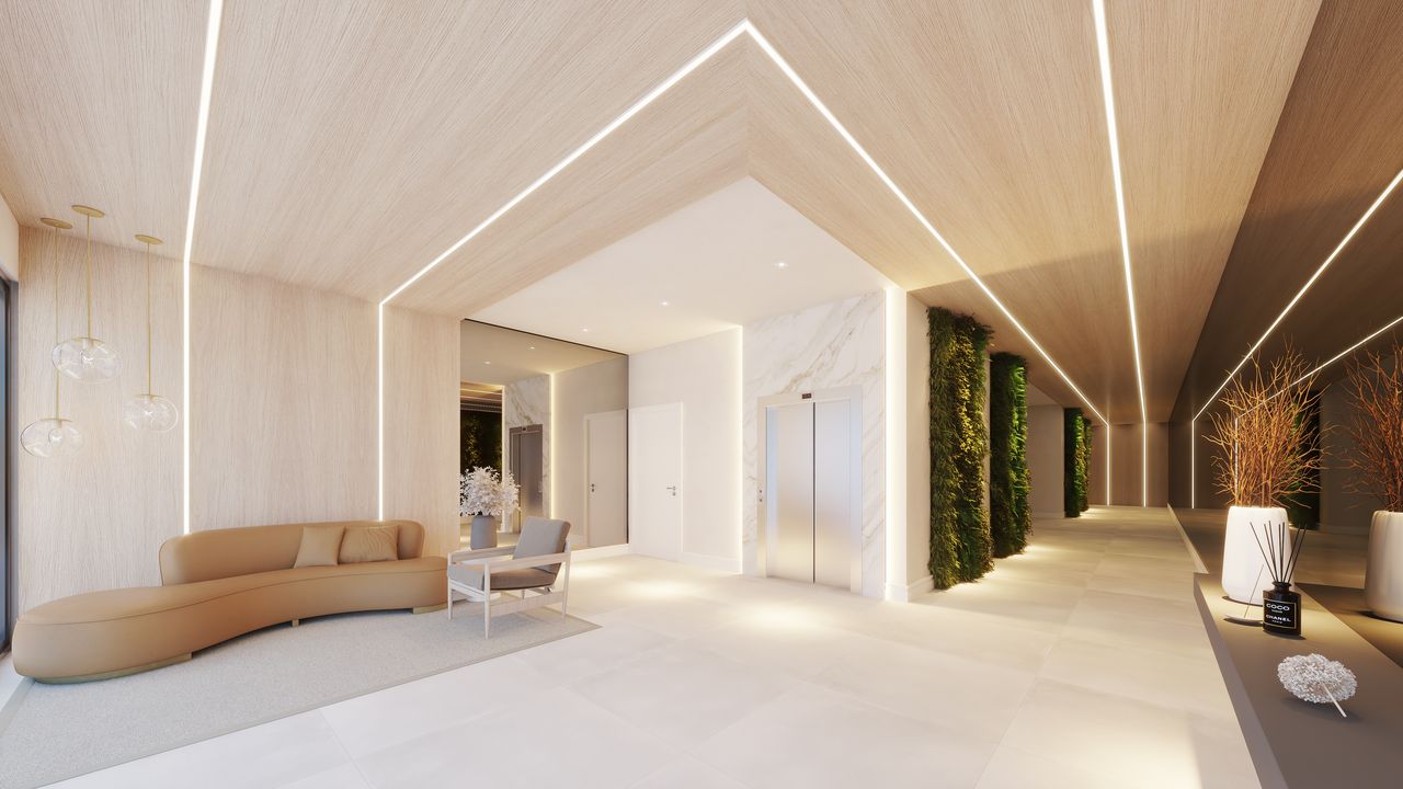 O projeto apresenta uma fachada contemporânea e áreas comuns, incluindo o hall de entrada, mobiliadas e decoradas, com foco em funcionalidade e estética.