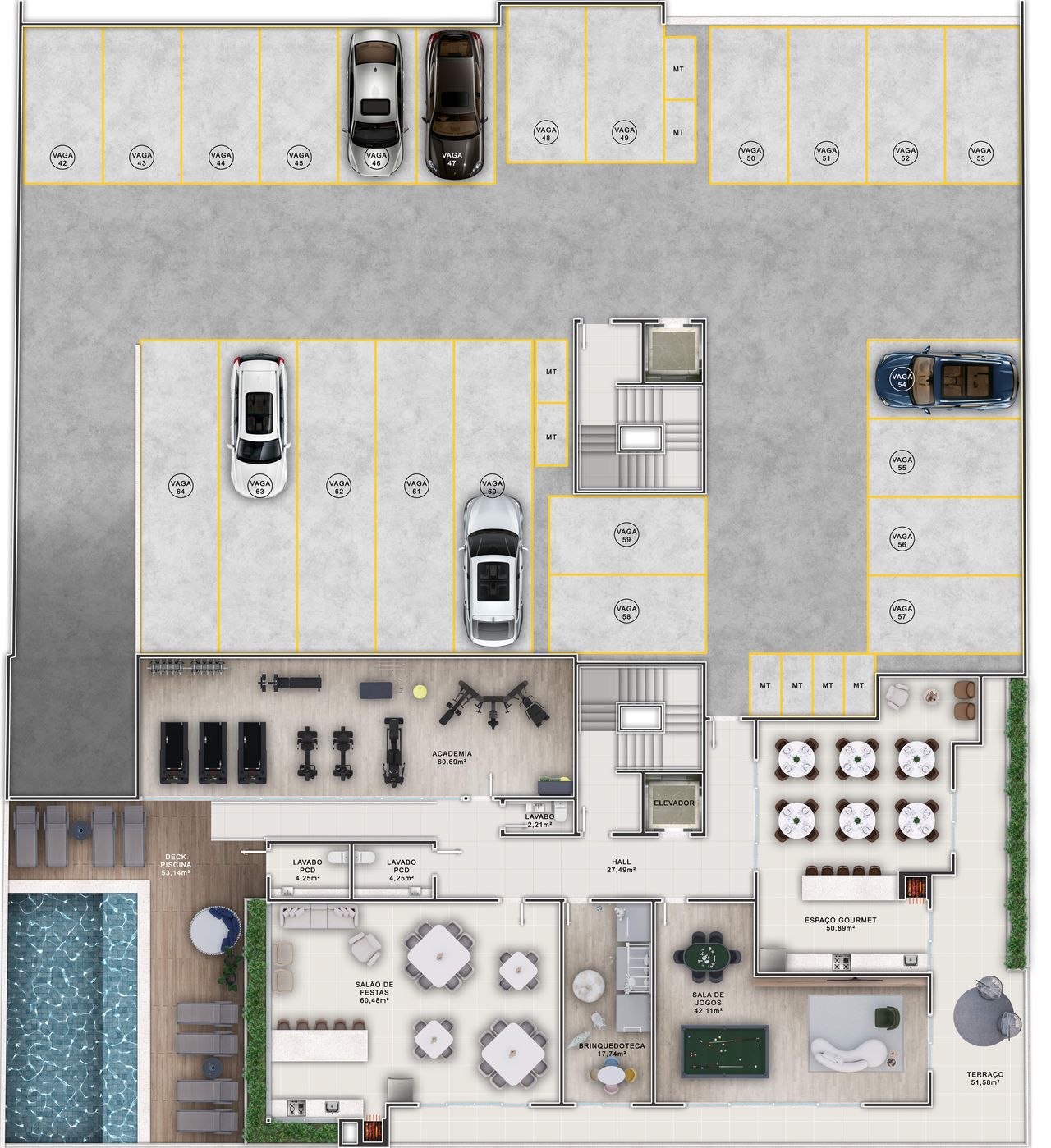 A área de lazer conta com piscina adulto e infantil, academia, salão de festas, espaço gourmet, brinquedoteca e sala de jogos.