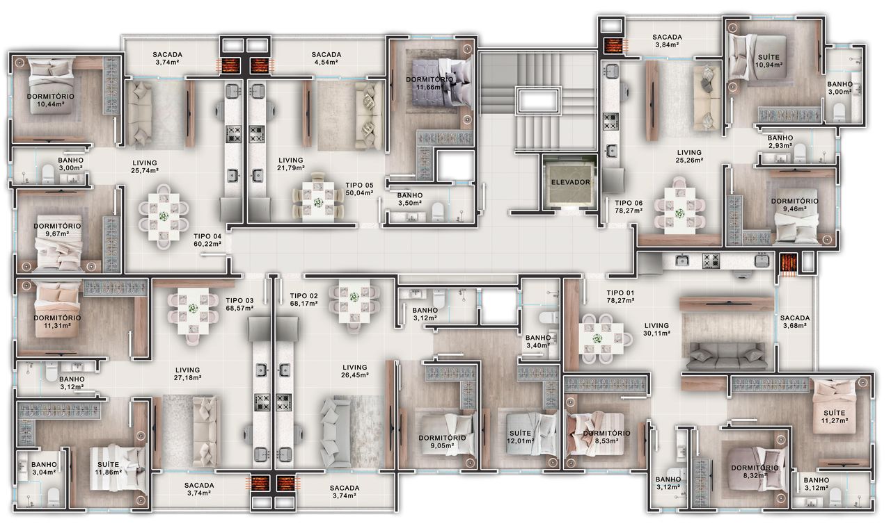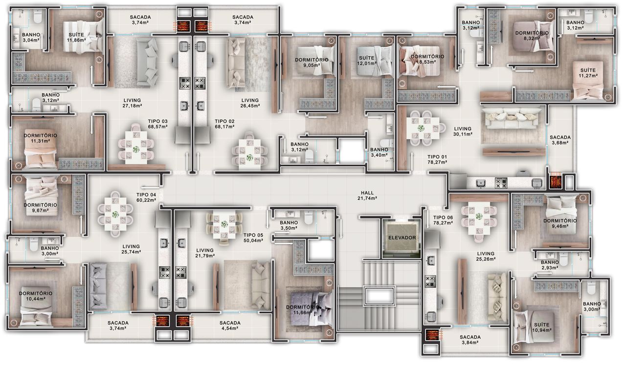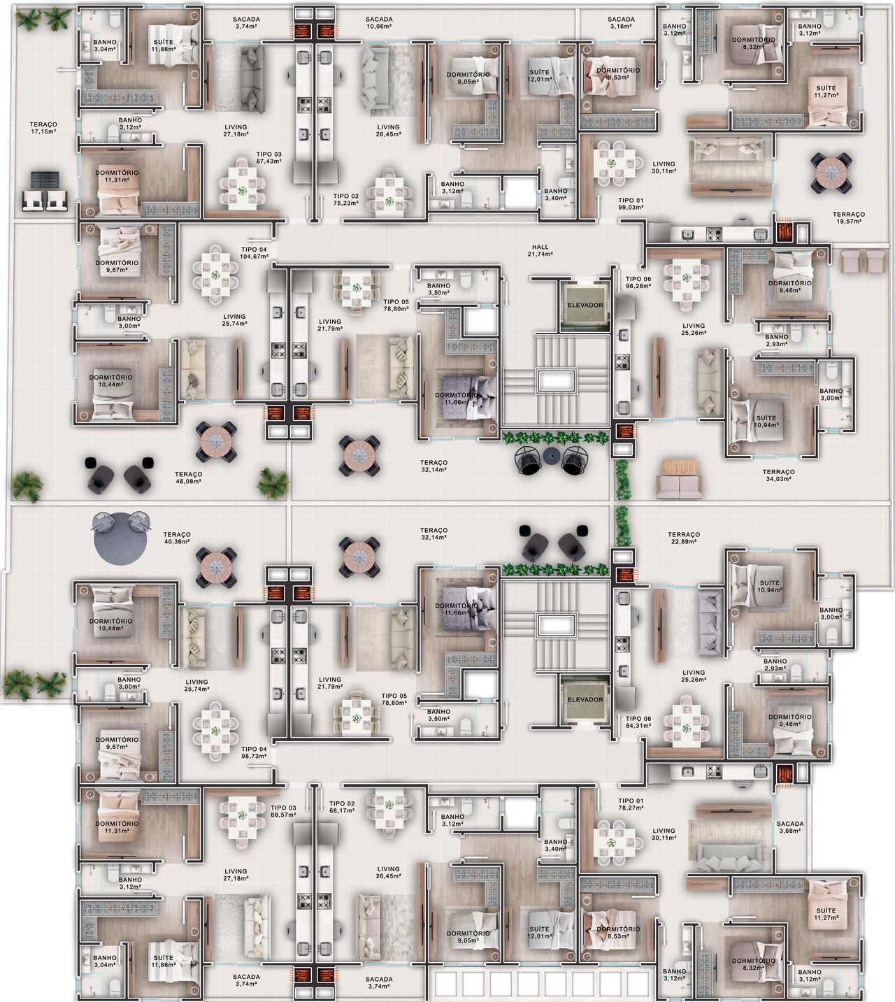 | APTO TIPO 01 | TORRE A | R$ 1.000.700,00 | 78,27 m² | 2 | 1 | 1 |