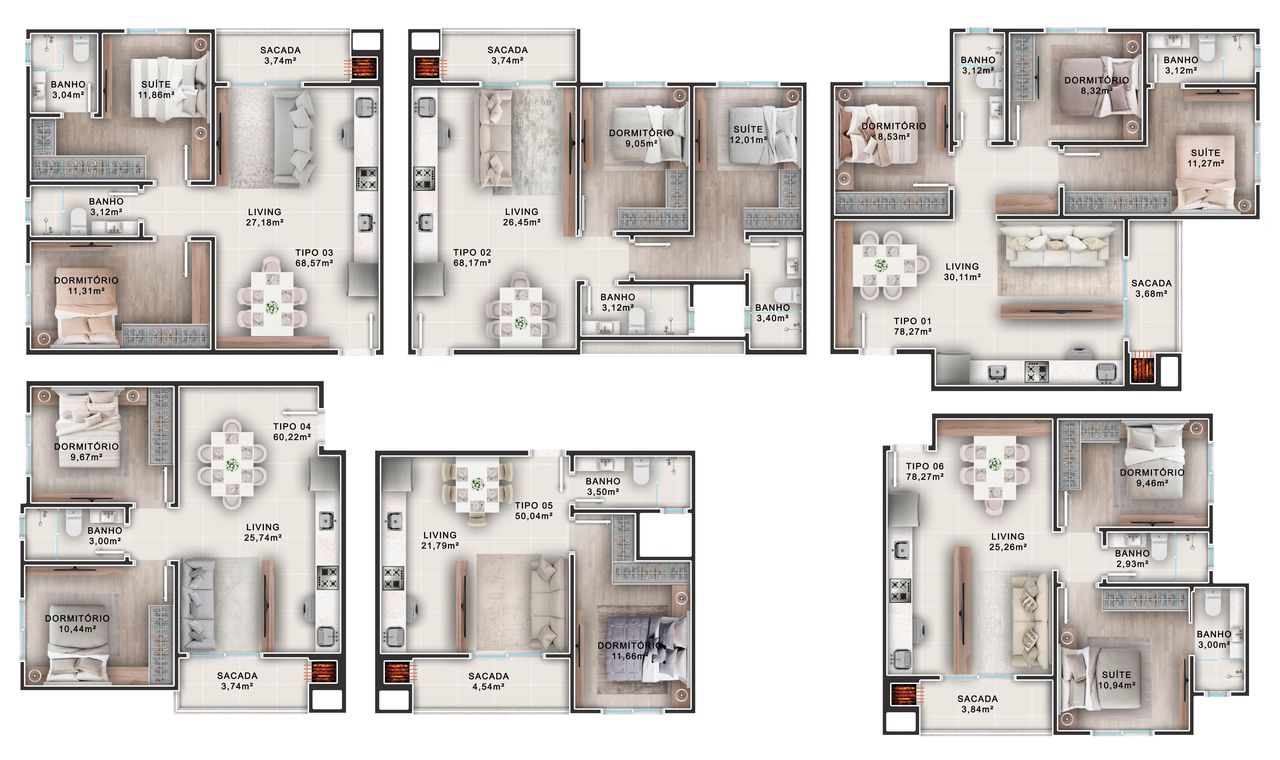 O empreendimento oferece apartamentos com 1 ou 2 dormitórios, sendo que algumas unidades possuem suíte. As áreas privativas variam de 50,04 m² a 78,27 m².