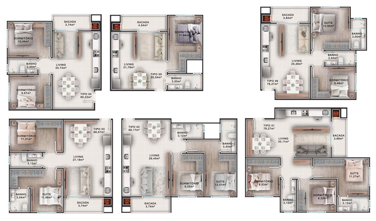 As unidades tipo oferecem plantas inteligentes, com living, cozinha, área de serviço e varanda gourmet. As metragens são compactas, variando de 50,04 m² a 78,27 m². As configurações incluem desde apartamentos de 1 dormitório até unidades com 2 dormitórios, sendo 1 suíte. Todas as unidades possuem 1 vaga de garagem e acabamentos como espera para split.
