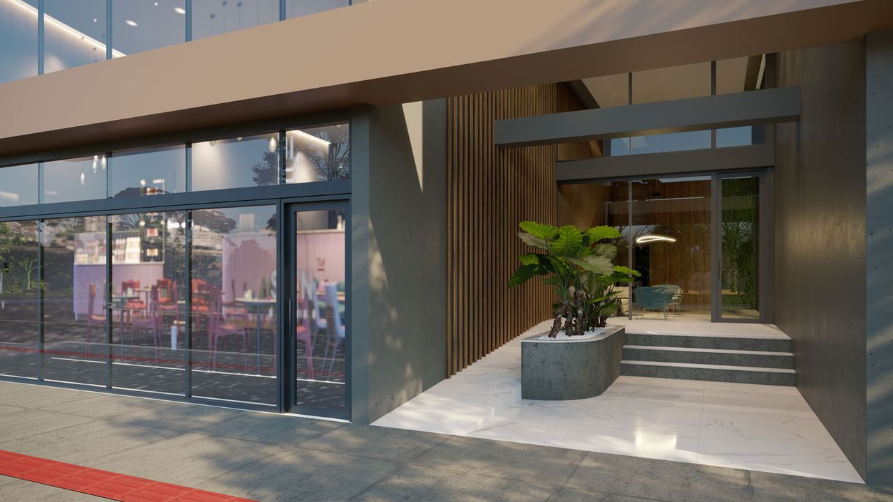 O projeto incorpora painéis de energia solar e sistema de reaproveitamento de água, visando eficiência energética e hídrica.