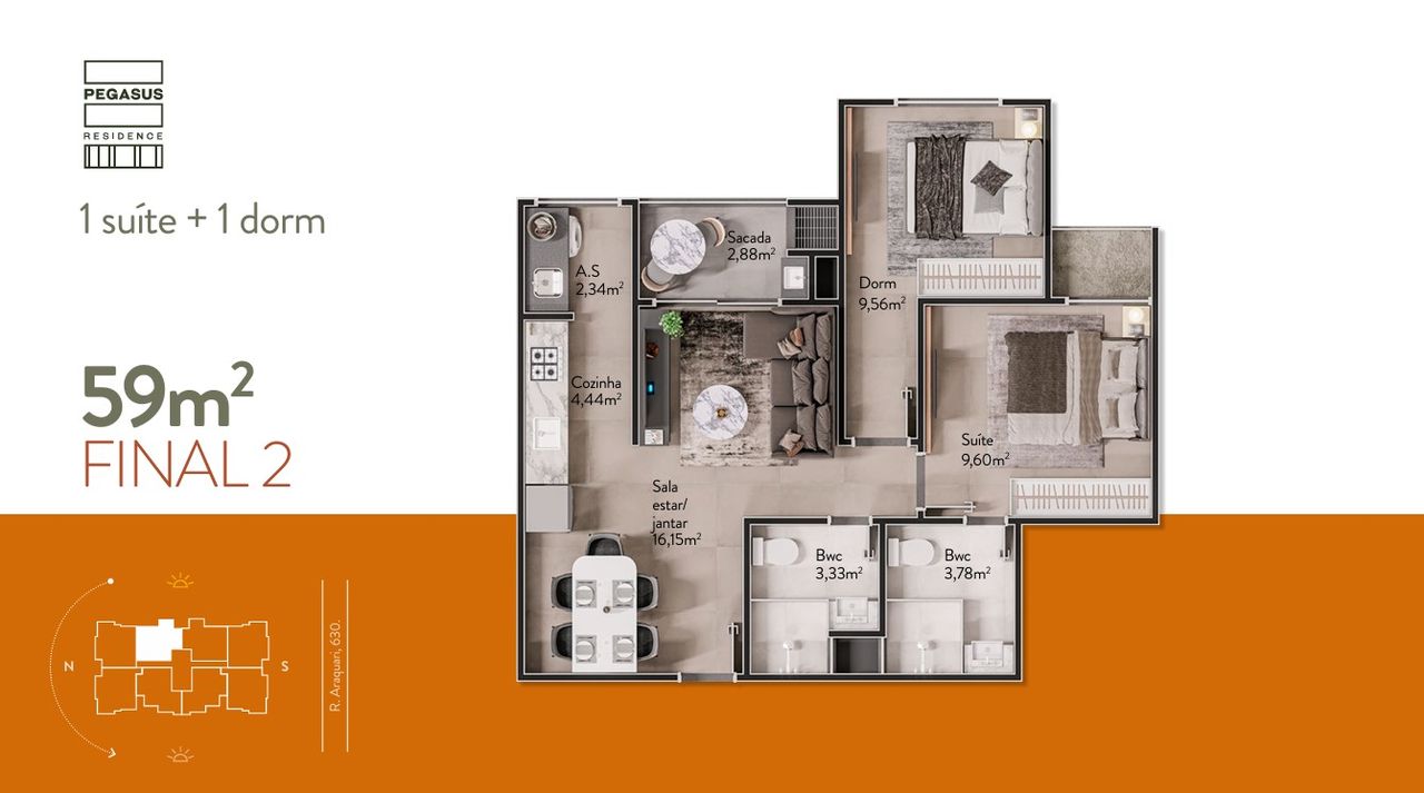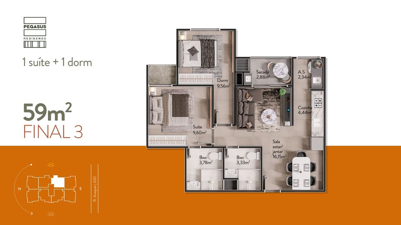 Apresentamos o Pegasus Residence, um empreendimento com 3 torres e um total de unidades que oferecem plantas inteligentes, variando de 59,03 m² a 95,56 m². As tipologias incluem Salas e Apartamentos Tipo, com opções de 2 dormitórios e 1 suíte, todos com 1 vaga de garagem. O projeto se destaca pelo acabamento em porcelanato, infraestrutura para ar condicionado e fechadura com senha na porta de entrada.