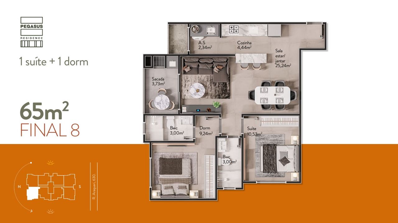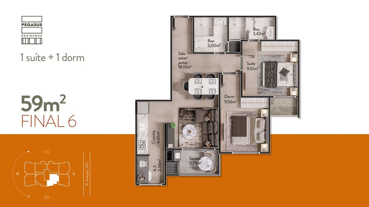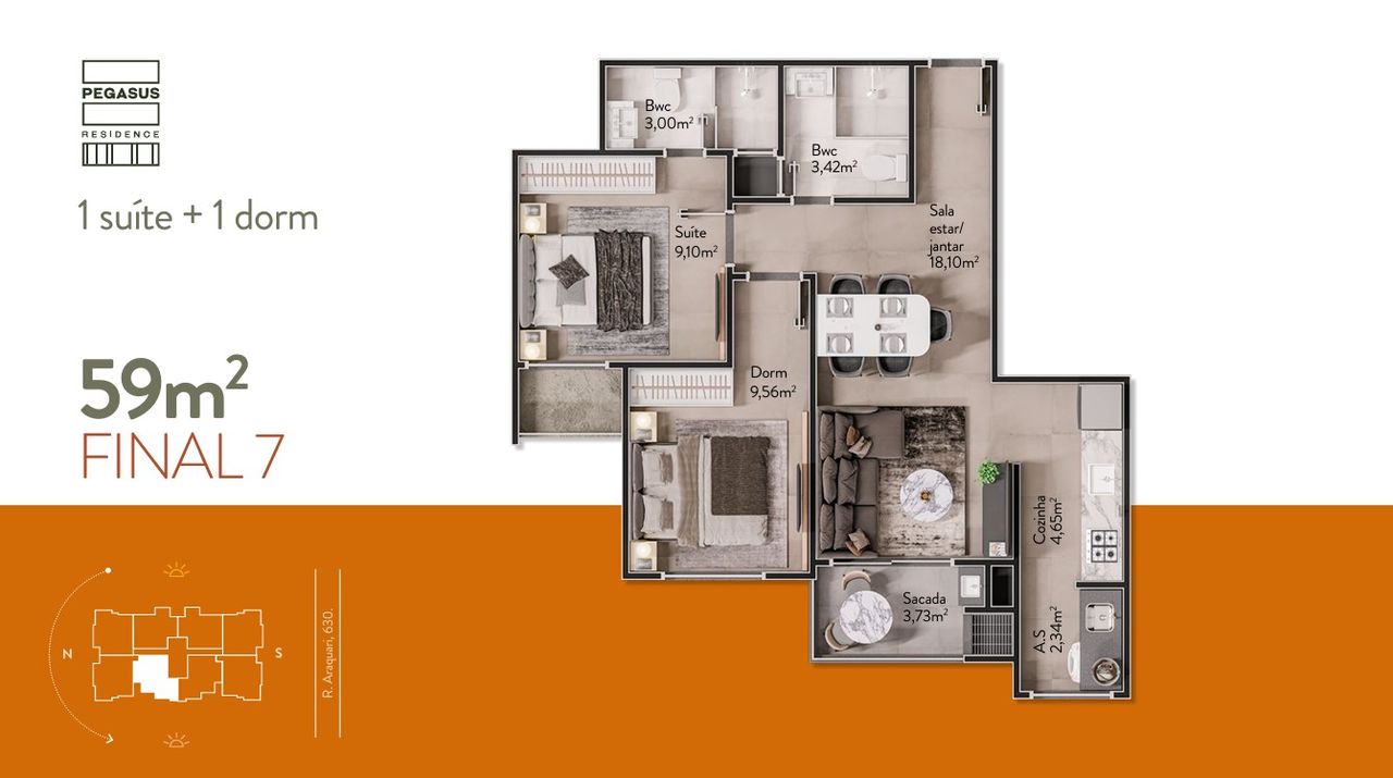 As unidades tipo do Pegasus Residence são projetadas para otimizar o espaço, apresentando 2 dormitórios, sendo 1 suíte, e 1 vaga. O acabamento inclui porcelanato e infraestrutura para ar condicionado. A distribuição interna visa funcionalidade, proporcionando conforto para moradia ou locação. Consulte as plantas para verificar as diferentes disposições de 59,03 m² a 65,64 m².