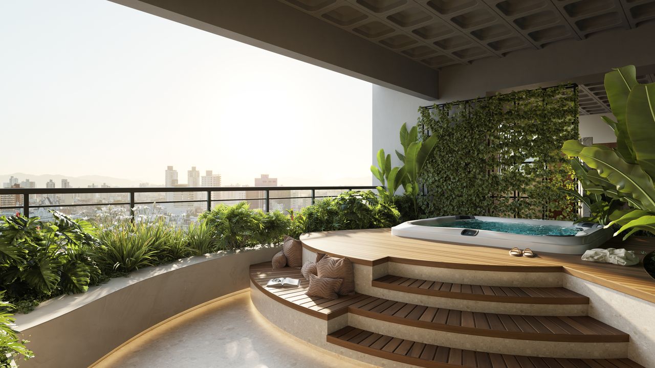 O design foca na modernidade e funcionalidade, com fachada contemporânea e ambientes multifuncionais, incluindo um rooftop duplo e jardim suspenso.