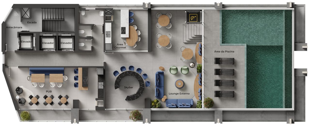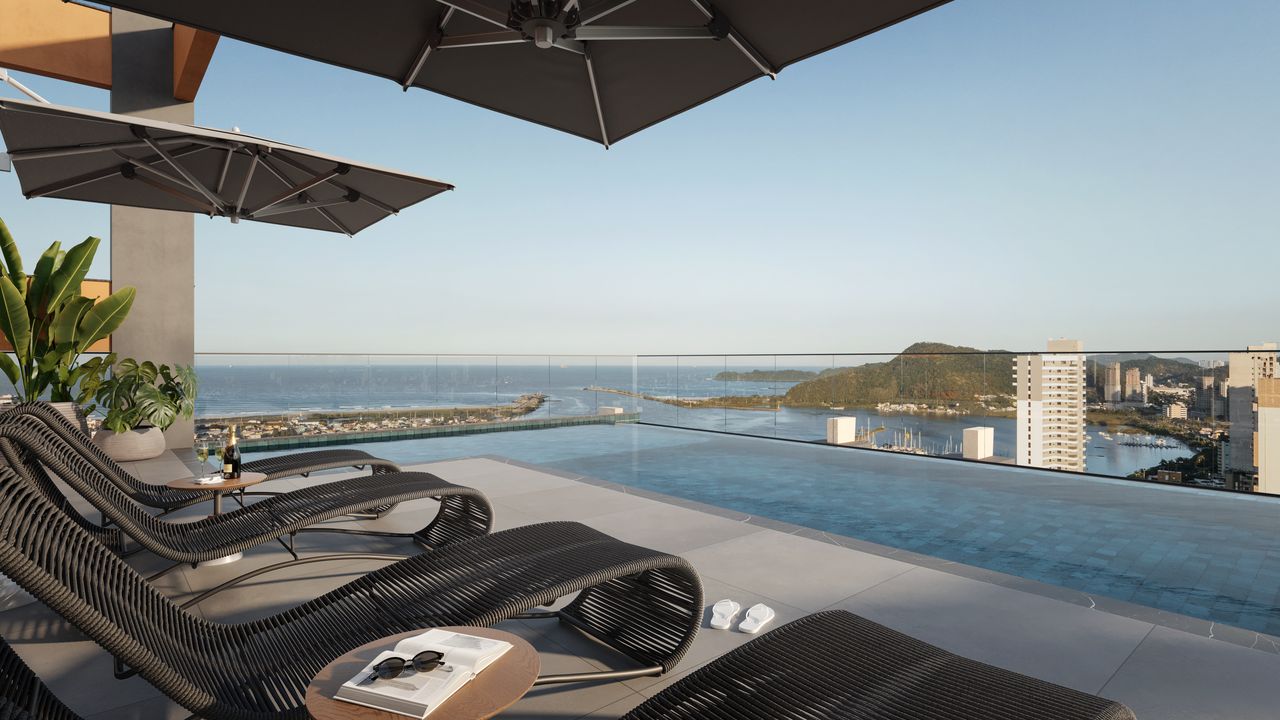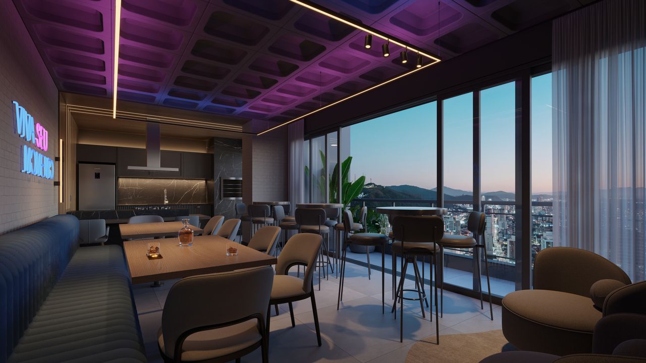 O rooftop oferece piscina com borda infinita, sky bar, pub e espaço gourmet com vista panorâmica.