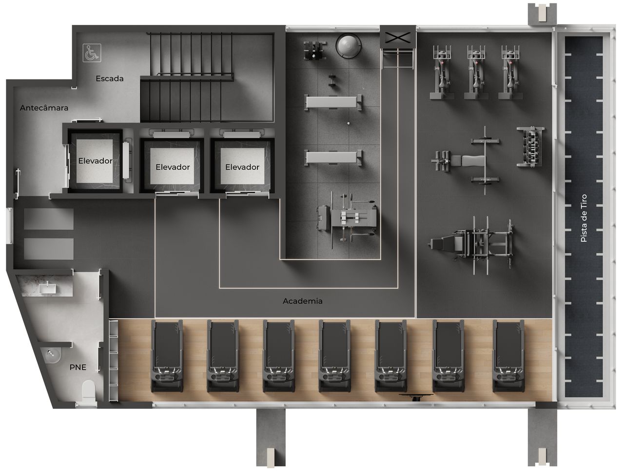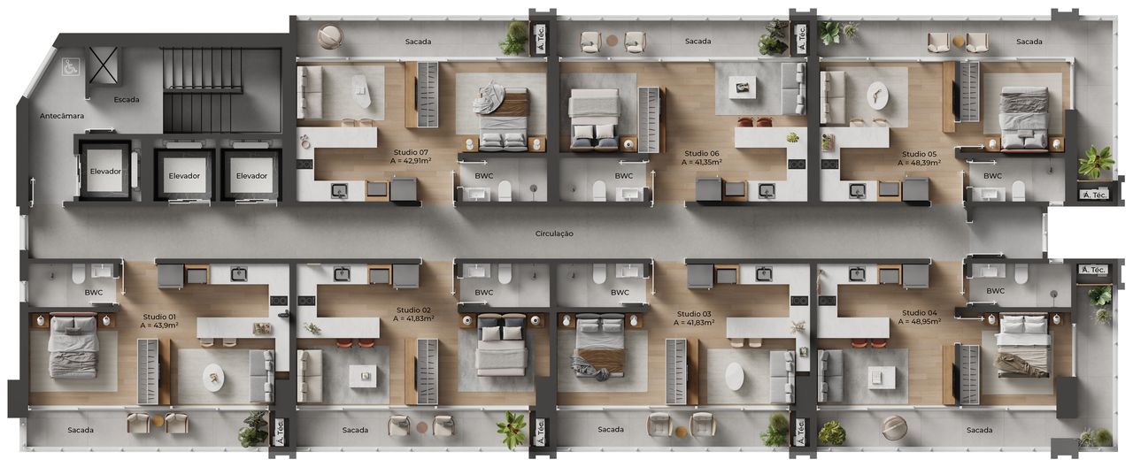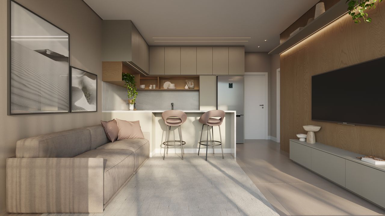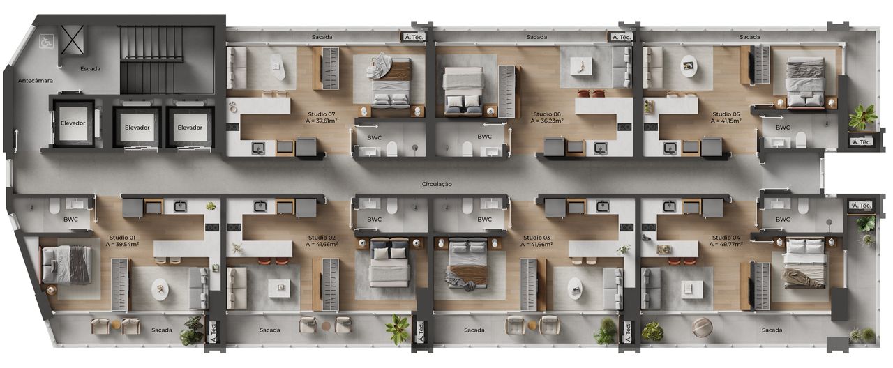 Os studios do Pulse Smart Living foram desenhados para o público que busca praticidade e localização central. Com plantas que variam de 36,23 m² a 114,00 m², as unidades possuem sacada, cozinha integrada e fechadura eletrônica, proporcionando um ambiente funcional e conectado. A distribuição interna favorece a iluminação natural e a vista panorâmica da cidade.